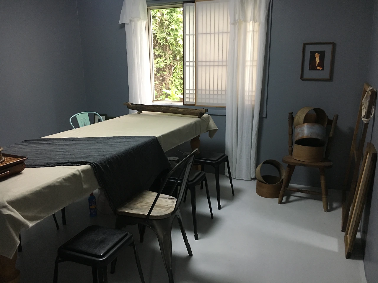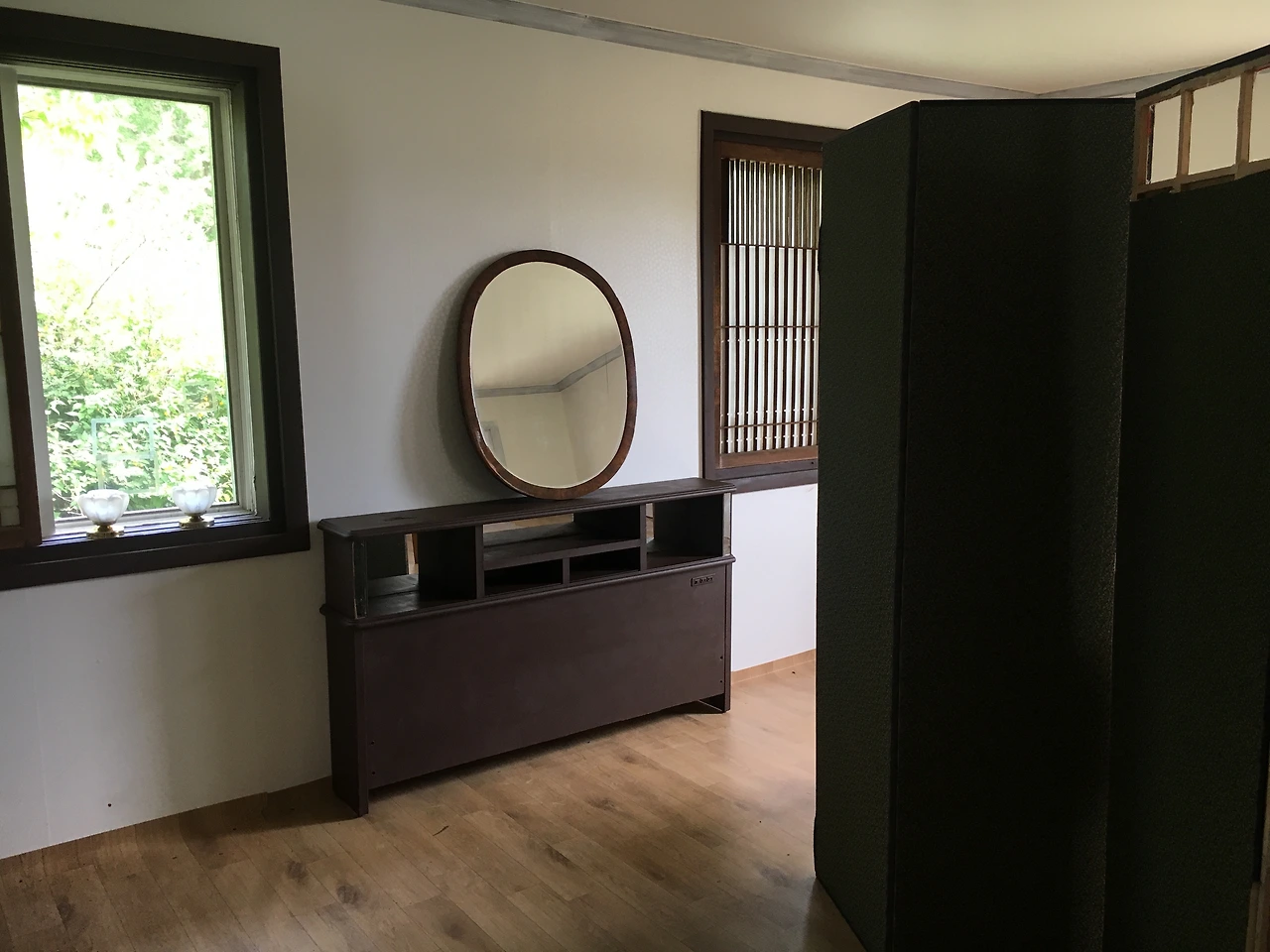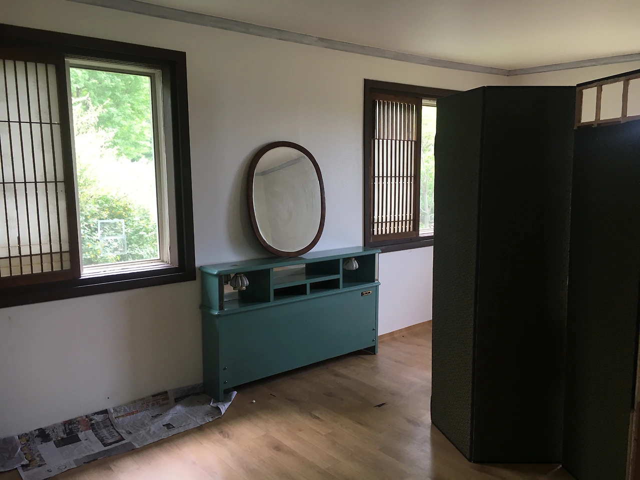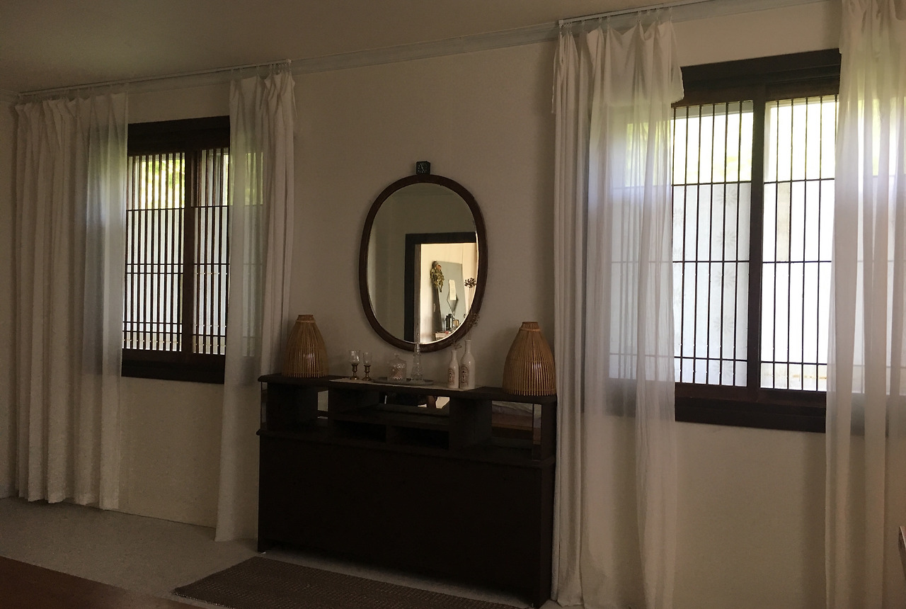 재개발 지역을 우연히 지나던 중 구조가 특이하여 차에 싣고 코테지에 가져왔는데 쓰임새를 고민하던 차에 가장 큰방의 창문 사이 공간에 딱 들어가는 게 아닌가. 마치 기다렸다는 듯이.