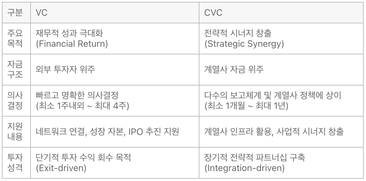 통상적으로 VC는 FI(Financial Investor, 재무적투자자)로서 금전적 지원(투자)과 보유한 GP(General Partner, 업무집행조합원) 네트워크를 소개해 주며 회사의 빠른 성장을 돕고, 향후 M&A(인수합병) 혹은 IPO(기업공개)를 통해 Exit 하는 비교적 단순한 비즈니스모델을 갖추고 있는 반면, CVC는 SI(Strategic Investor, 전략적투자자)로서 기업 차원에서 상호 간 시너지를 창출할 수 있고, 기업이 자체적으로 구축한 생태계를 통해 기업의 성장을 직접적으로 지원하는 구조를 갖추고 있습니다.