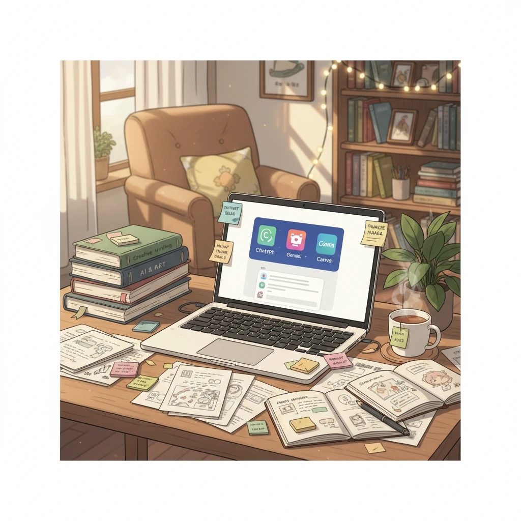 > A cozy 2D anime-style illustration of a creative workspace. On the desk, there is a laptop showing AI tools like ChatGPT, Gemini, and Canva. Around it are open notebooks, scattered papers, unfinished drafts, books, and sticky notes full of content ideas. The mood feels warm, reflective, and hopeful — representing someone’s wish to improve and complete their creative projects before the new year. Soft pastel tones, gentle lighting, detailed background, clean composition. 1:1 aspect ratio.