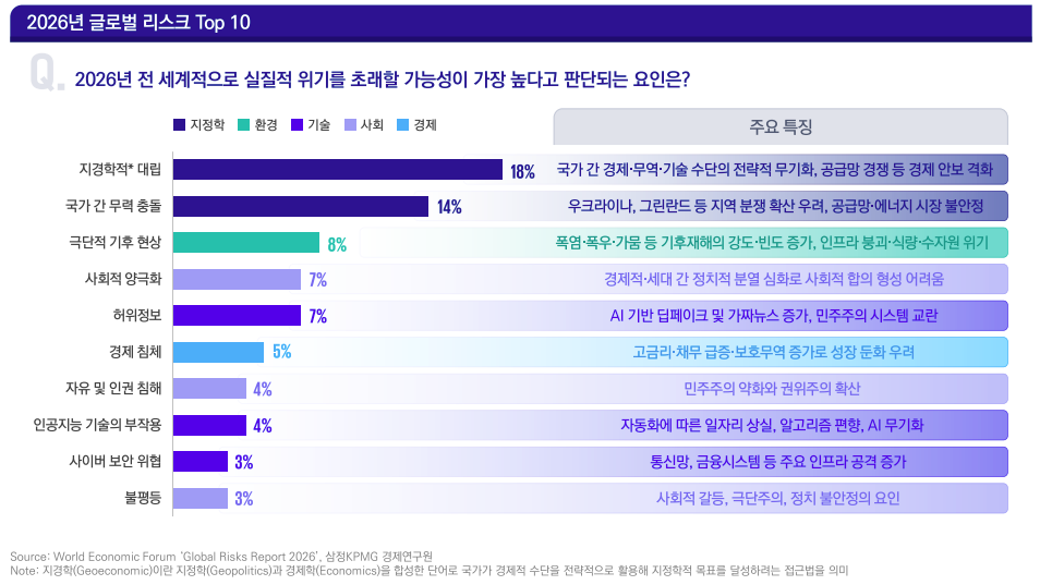 안녕하세요. 오늘은 매년 1월 스위스 다보스 포럼을 계기로 발간되고 있는 세계경제포럼의 '2026년 글로벌 리스크 리포트(Global Risks Report 2026)'를 소개하고자 합니다. 이 리포트는 전 세계 1,300여 명의 전문가와 11,000여 명의 비즈니스 리더들의 의견을 종합하여 향후 2년 및 10년 내 세계가 직면할 핵심 위협을 분석하고 있습니다.
