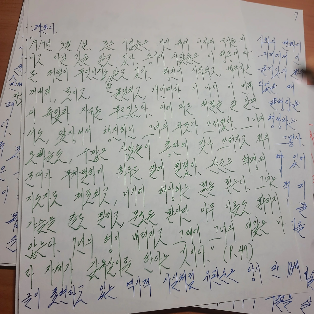 앞서 운동 선수의 연령이 올라가며 플레이스타일이 변모한다는 것은 인간의 생애를 거시적으로 보면 안정과 안전을 지향하고 사회의 변화에 순응하는 경향이 있다는 것을 상징하는 의미해서 언급한 것입니다. 글의 서두에서 언급한 다윗과 골리앗의 전투 역시, 다윗의 나이가 완숙한 청년의 기운이 무르익은 시기였다면 손에 쥔 돌팔매를 포기하고 줄행랑을 쳤을지도 모를 일입니다. 왜냐하면 개인의 의지를 형성하는 생물학적 경향성이 신체의 완전한 성숙과 함께 안정을 추구하는 방향으로 변화하기 때문입니다. 그러한 면에서 일제의 공포 정치에 순종하는 것이 개인의 오랜 생존에 유리했을 것이지만, 우리 선조들은 대한민국의 후손들에게 자주적 미래를 선물하기 위하여 자신의 삶이 몰락할 것을 충분히 예상하였음에도 생래적 순리를 거슬러 독립운동에 나섰습니다. 그것은 같은 인간으로서 이해할 수 없는 결정이기도 합니다. 전위적 예술가 차학경이 남긴 저술 《딕테》의 텍스트를 살펴보겠습니다.