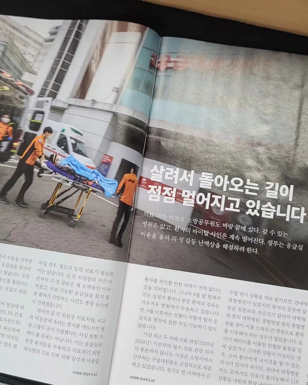 <시사인> 기자에게 문자가 왔다. 의료 파업이 장기화하는 시점에서 소방관이 겪는 고충이 궁금하다며 만나서 인터뷰를 하고싶다고 했다. 나는 인터뷰 대신 내용을 메일로 보내주겠다고 했다. 의·정 갈등에서 소방관은 주변인에 가깝다. 그래서 기자가 굳이 나를 만나서 취재하는 것보다는 그 시간을 아껴서 의사와 정부 측 입장을 자세하게 취재하는 것이 사안의 중심에 접근하는 보다 효율적인 방법이라고 생각했다. 그렇게 메일을 보낸 다음 날 기자에게 회신이 왔는데 ‘보내주신 글을 읽는데, 제가 같이 심장이 떨렸습니다. 데스크에서는 보내주신 글 일부만 인용하기 아쉽다고 기고 형태로 잡지에 실으면 어떻겠냐고 해서요’라고 말하는 내용이었다.