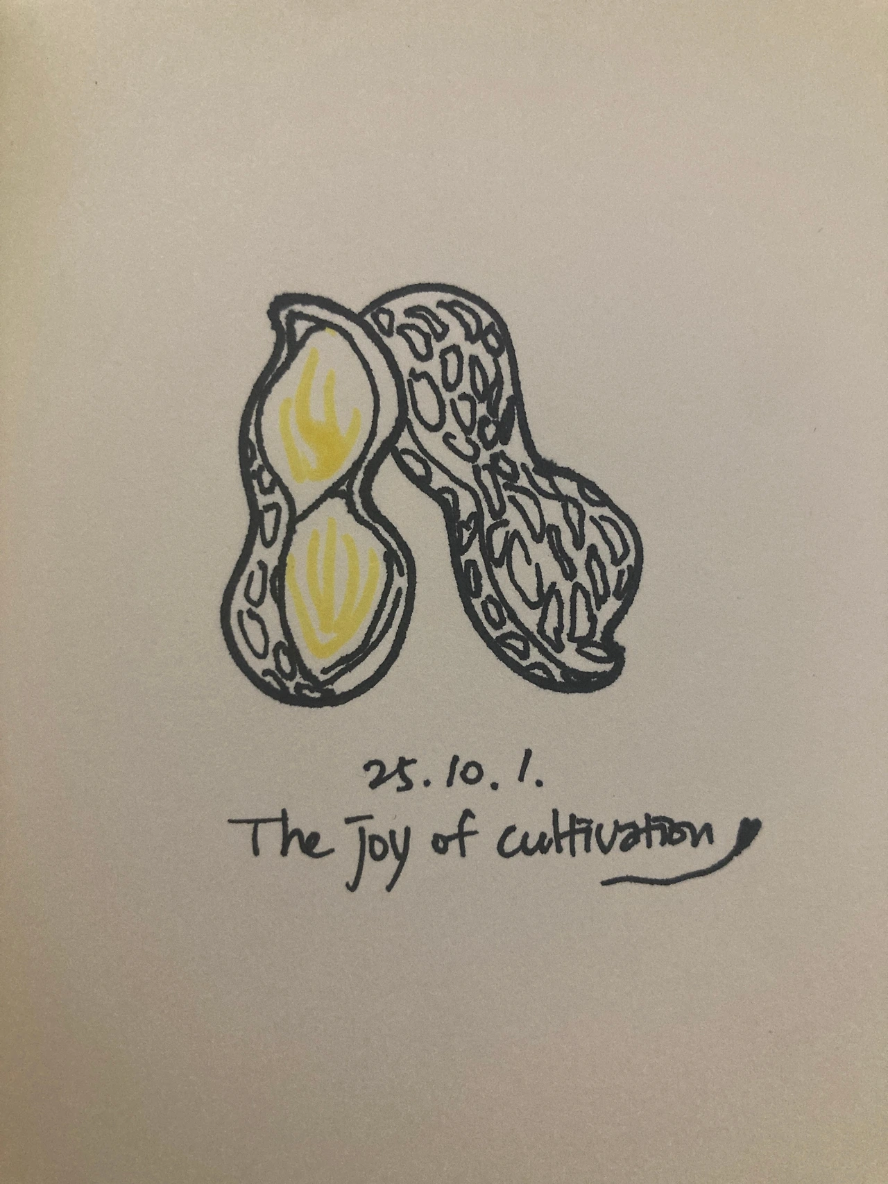 애써 수확한 땅콩은 햇볕에 오랫동안 말려야 한다. 그렇지 않으면 금세 곰팡이가 피기 시작한다. 곰팡이가 핀 땅콩은 1분 1초가 아쉬우므로 속히 물에 넣고, 소독을 위해 베이킹소다를 풀어 삶는다. 삶긴 땅콩을 대접에 담는다. 자리잡고 앉아 땅콩 껍질을 까노라면 상념이 없어진다. 모난 윗부분 절단면을 엄지와 검지를 이용하여 자그시 누르면 깍지가 빡- 소리를 내며 열린다. 더러는 윗부분만 열리고 더러는 중간까지 열린다. 열린 틈새에 손끝을 넣은 채 양손으로 쥐고 벌리면 태아 같은 땅콩이 모로 누워 옹크리고 있다. 둘인 것도 있고 오도카니 혼자인 것도 있다. 깐 땅콩을 입에 털어넣거나 그릇에 담는다. 어쩌다 흘린 것은 바닥에 떨어졌다는 핑계로 입에 하나 더 집어넣는다.