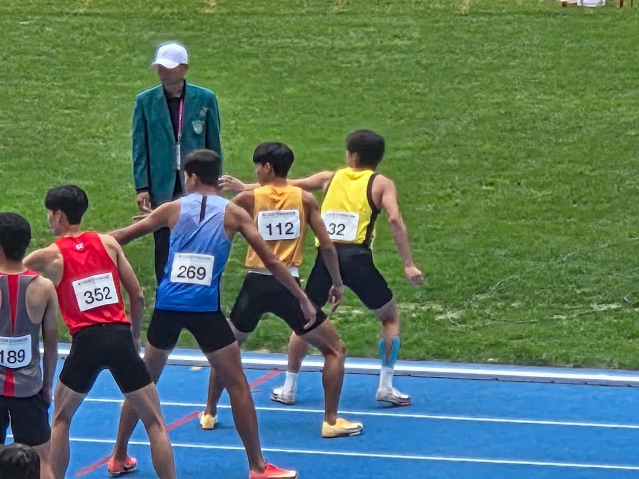 아, 네, 지금 방금 첫 계주 주자 선수들이 출발선에 섰는데요. 준비 운동에 이어 심판의 출발 총소리에 온 신경을 집중하고, 귀 쫑긋하면서 초긴장(초간장 아님)을 가까스로 다스리면서 출발을 준비하고 있습니다. "탕" 소리와 함께 우르르 한꺼번에 굶주린 사자가 먹이를 보고 튀어나가듯 일제히 쏜살같이 달려갑니다. 마치 경주마가 눈을 가린 채 앞으로 튀어나가는 것과 같은 경마 경기를 눈앞에서 직접 보는 듯합니다. 네, 400m 계주 첫 주자 선수가 돌진하듯 뛰어나갑니다. 그다음으로는 순서대로 2번 여자선수가 바톤을 넘겨받아, 오른손으로 바톤을 옮겨 쥐면서 손에 꽉 쥐고 잘 뛰어나가고 있습니다.