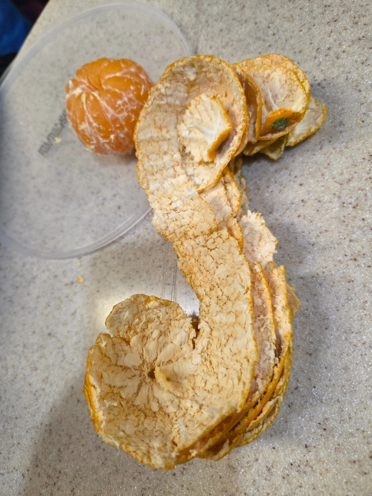 사진) 아들내미가 귤껍질을 까 놓는 매우 독특하고 심오한 방법! 배우고는 싶은데, 잘 될까요?