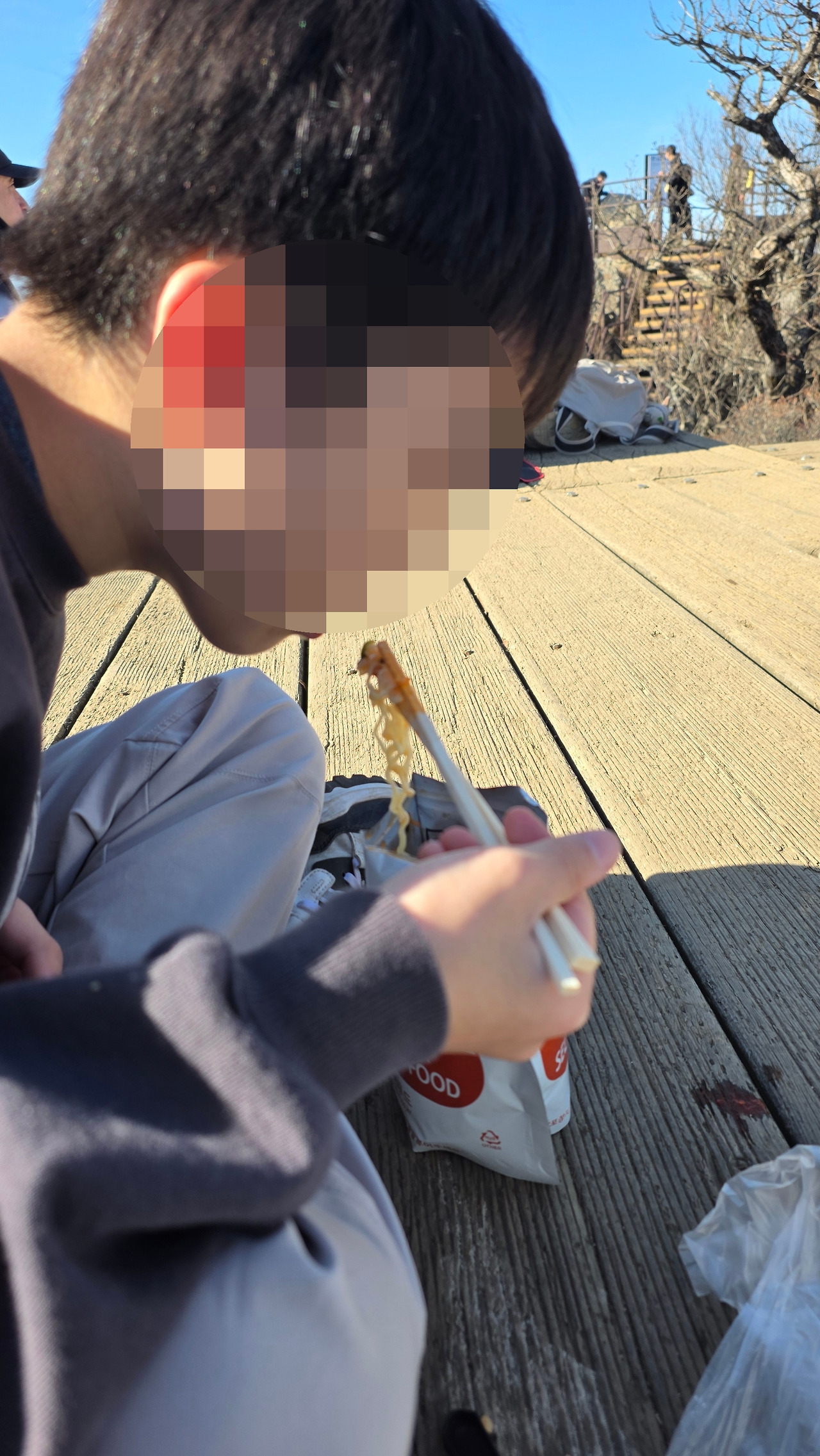 정상석에서 인증샷을 찍고 바로 옆 봉우리에 마련된 휴게 장소에서 점심을 차린다. 이 순간을 위해 준비했다. 찬물만 부어도 끓어오르는 전투식량... 라면밥! 신문물이 뿜어내는 엄청난 양의 스팀에 주변 등산객들의 이목이 집중되었다.