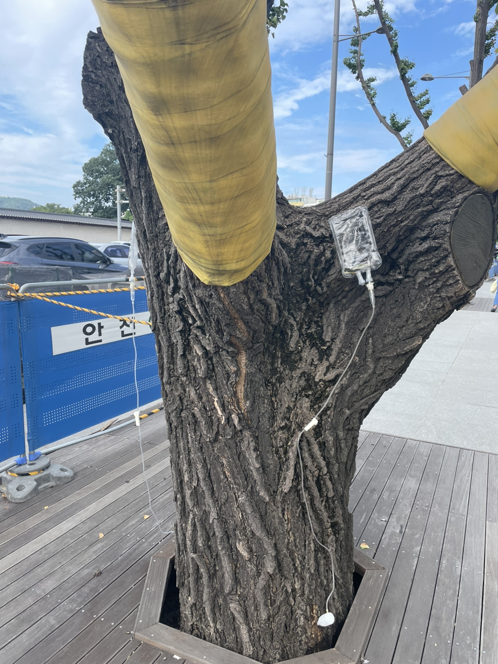 경복궁 근처에서 수액을 맞고 있는 나무들을 봤다.