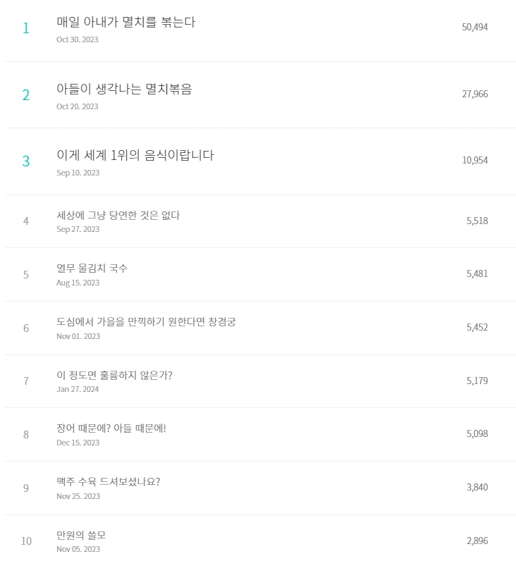조회수 1,2위의 글도 단순히 멸치 이야기가 아니라, 아내 이야기이고, 아들 이야기이다.