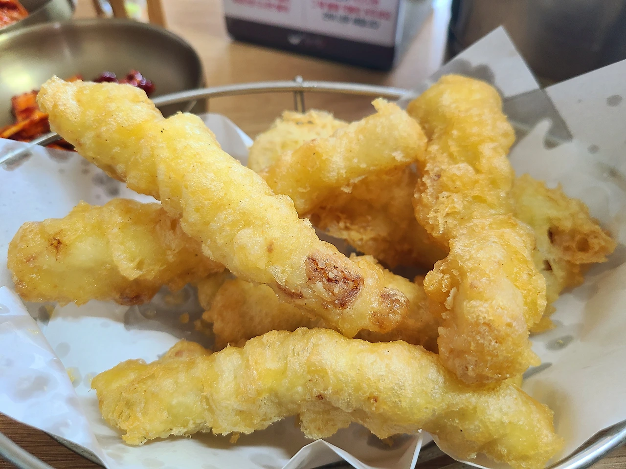 그래도 마침 식사를 마치고 나오는 분들 자리가 나서 자리를 잡고 복칼국수와 튀김을 시켰다.