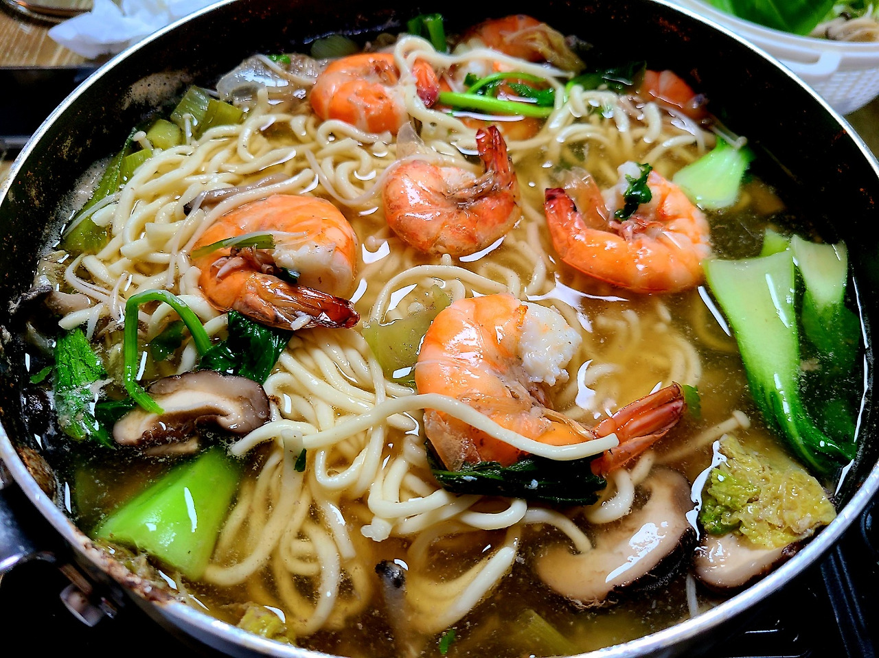 마지막으로 새우를 넣고 새우를 조금 건져 먹고는 진한 새우 맛의 해물 육수를 만든 뒤 칼국수 면을 삶았다.