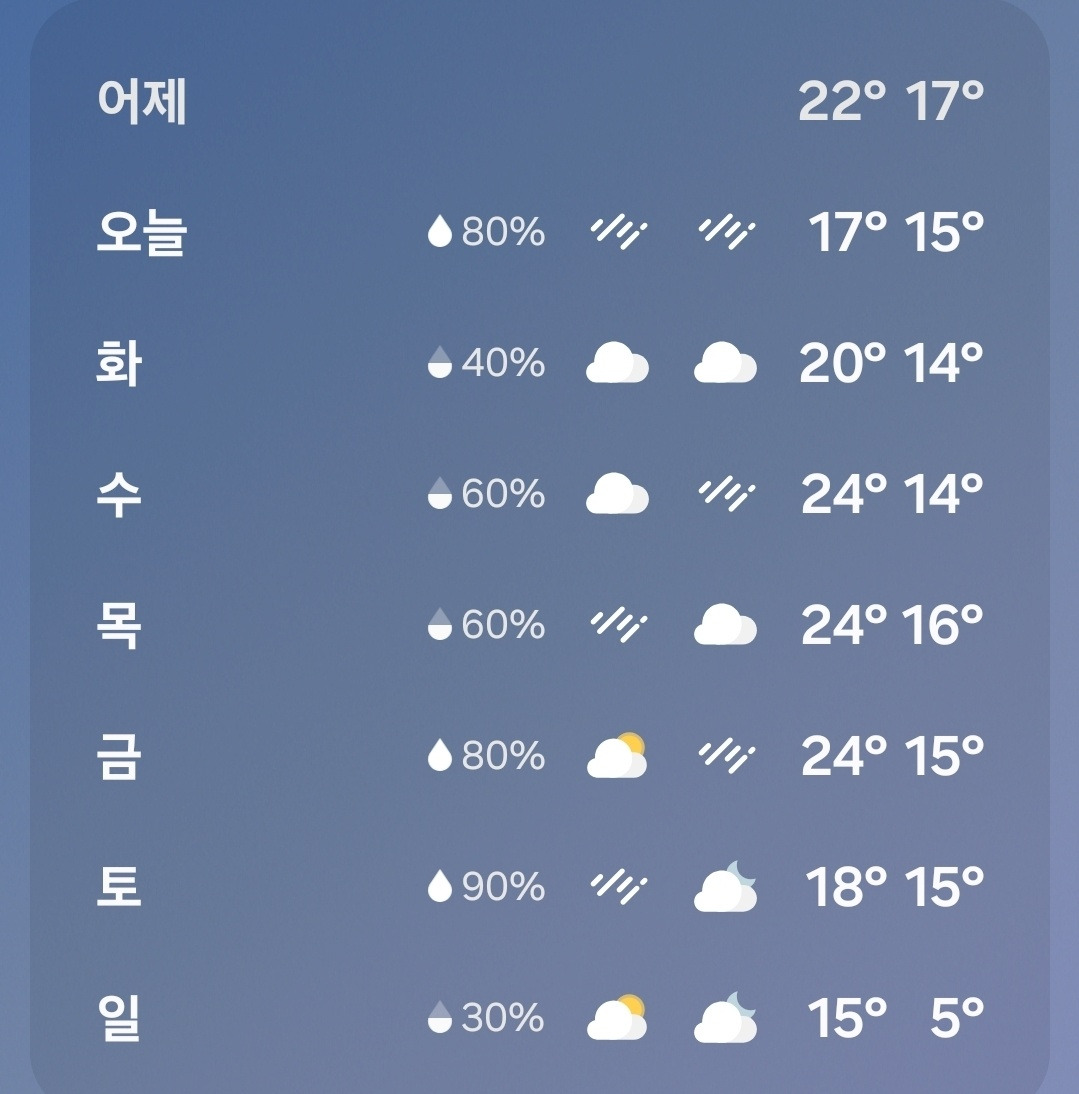 이번 주 일기 예보를 봐도 비와 구름의 콜라보일 뿐 해가 활짝 웃는 그림조차 보이지 않는다.