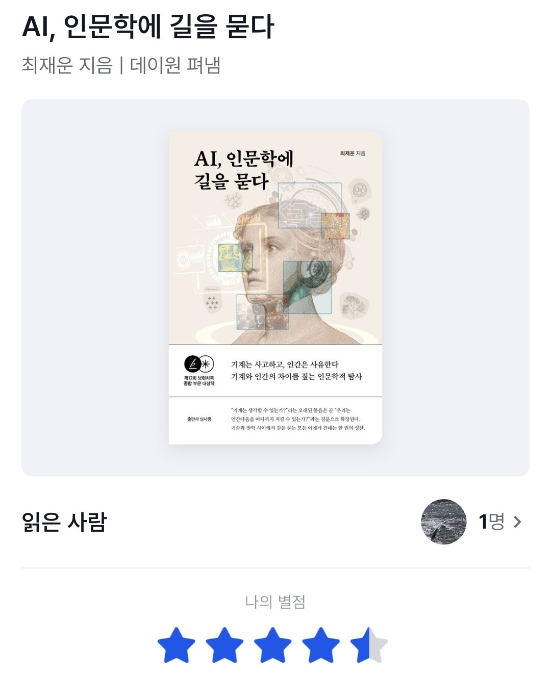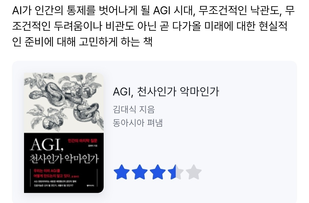 이러한 때에 AI에 대해 맹목적인 두려움이나 맹신을 하기보다 이것이 인터넷이나 핸드폰처럼 우리 삶에 지경을 넓혀주고, 능력을 확장하는 도구로 잘 활용하려면 잘 정리된 책을 읽고 생각을 정리하는 것이 필요한 것 같습니다.
