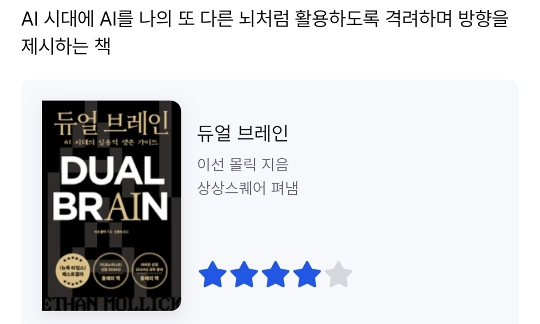 이 네 권의 책은 각각 활용(몰릭), 경계(김대식), 성찰(최재운), 실력(한지우)이라는 키워드로 연결되어 있습니다. 이 지식들을 연결해 보면 본인만의 AI 대응 전략을 세우는데 도움이 될 것 같습니다.