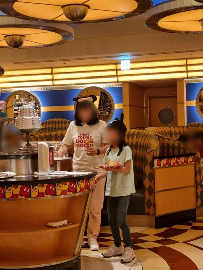 뷔페 조식을 먹을 수 있는 곳인데, 미키마우스 캐릭터들과 함께 사진도 찍을 수 있는 혜택도 부여된 곳이다. 맛있는 음식도 많이 먹고, 캐릭터들과 사진도 찍으면서 아침식사를 즐겼다.