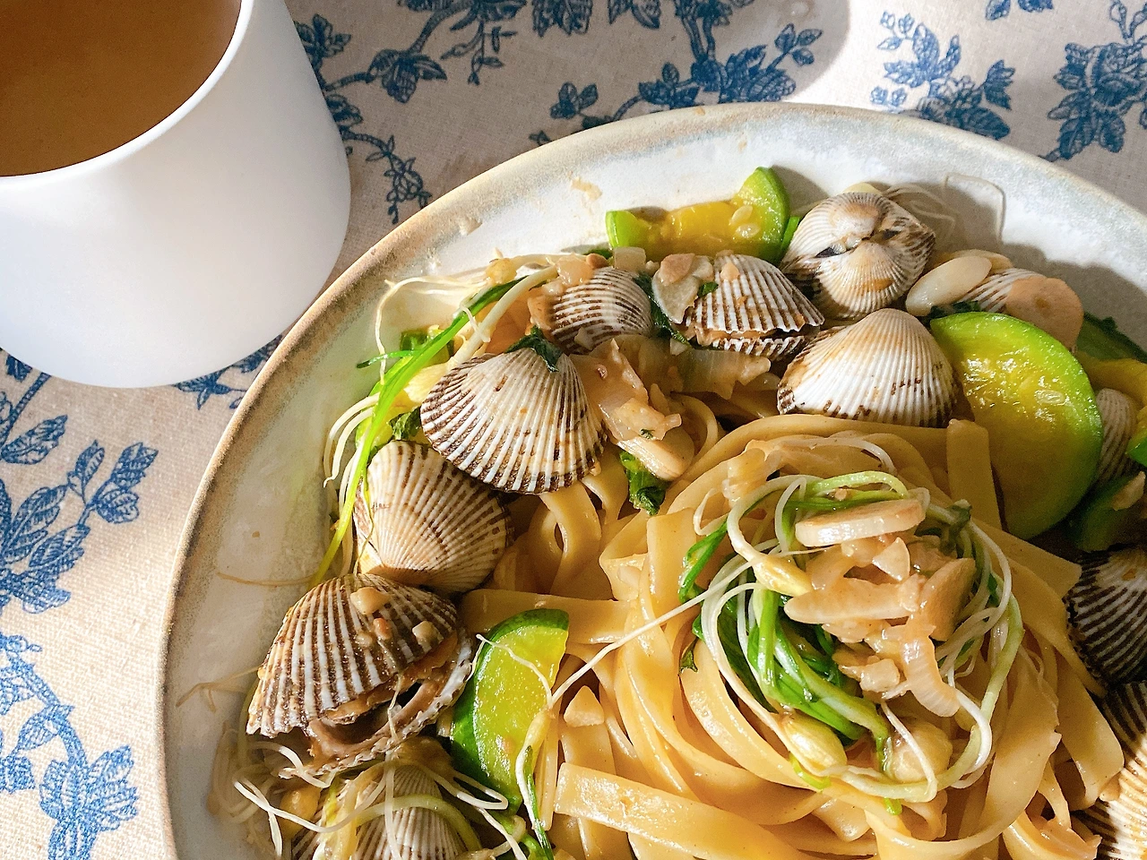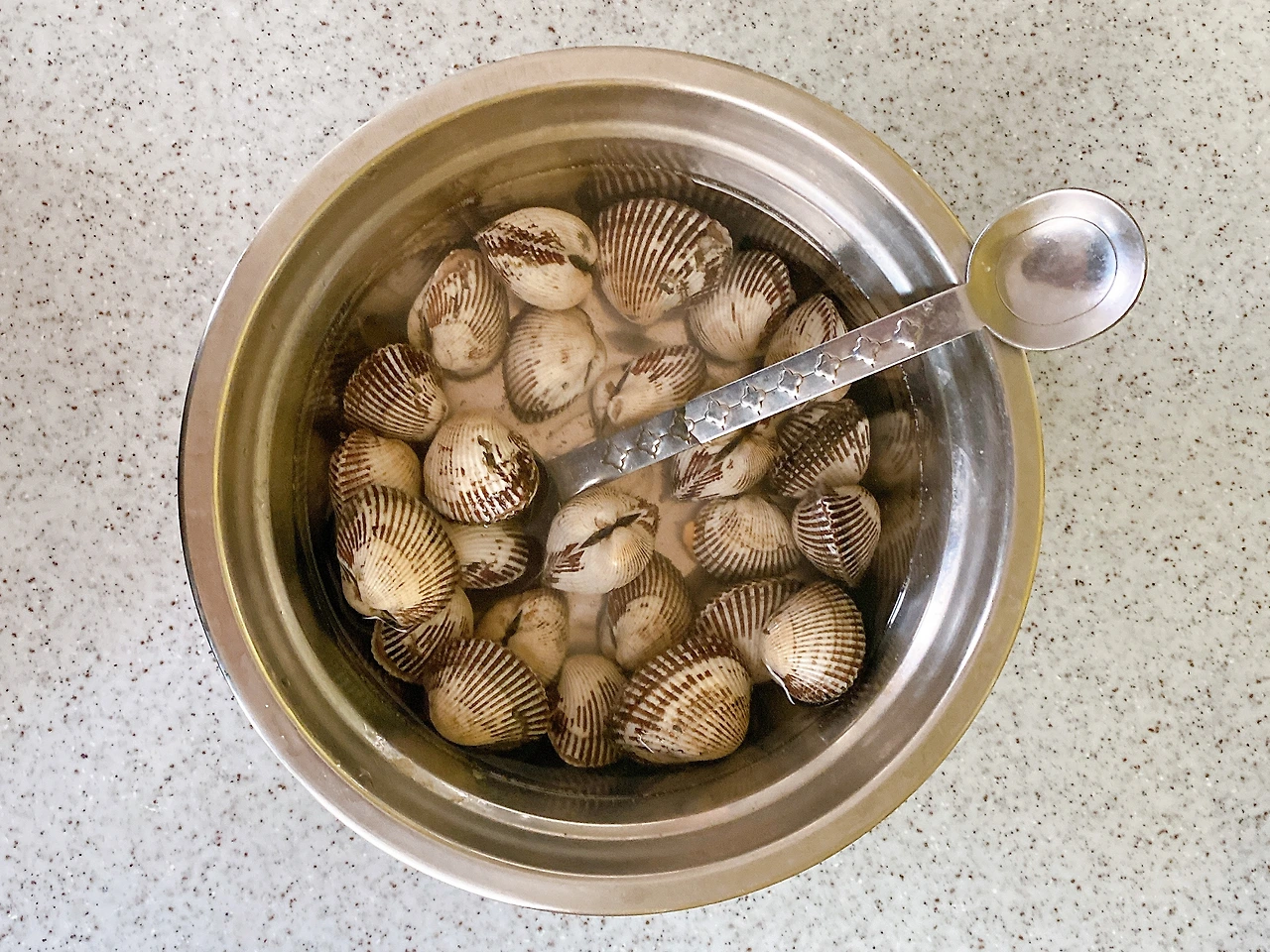 2. 꼬막 한 봉지는 찬 소금물 500ml에 소금 두 스푼을 넣어 30분가량 해감합니다. 이후 절반은 먼저 삶은 이후 삶은 물을 면수로 사용하고, 절반은 채소와 함께 조리합니다. 페투치네면은 8-10분가량 삶습니다.