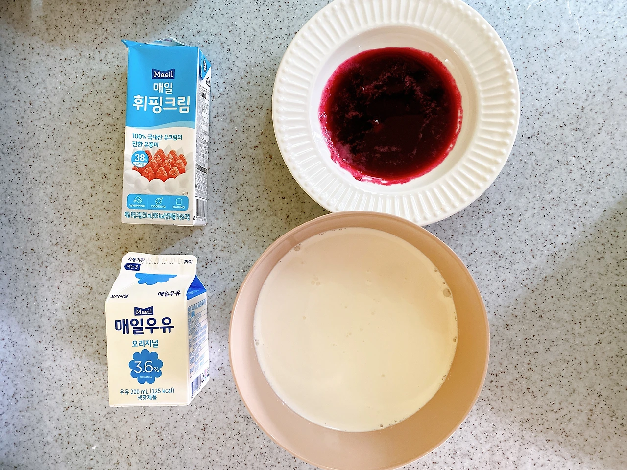 2. 껍질을 벗기고 블렌더에 간 비트와 우유 200ml, 휘핑크림 200ml를 통해 분홍빛 크림소스를 만들 준비를 합니다.