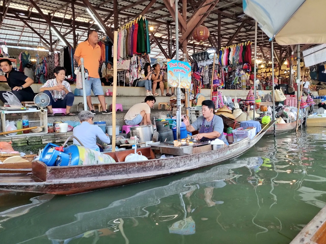 그렇게 한 시간 반을 달려 먼저 담넌사두억 수상시장에 도착했다. 배를 타고 강을 따라 형성된 상점을 둘러보고, 배 위에 차려진 상점에서 기념품이나 간단한 음식을 사 먹어보는 코스다. 흔히 방콕여행 사진에서 많이 보이던 그 수상시장 맞다.