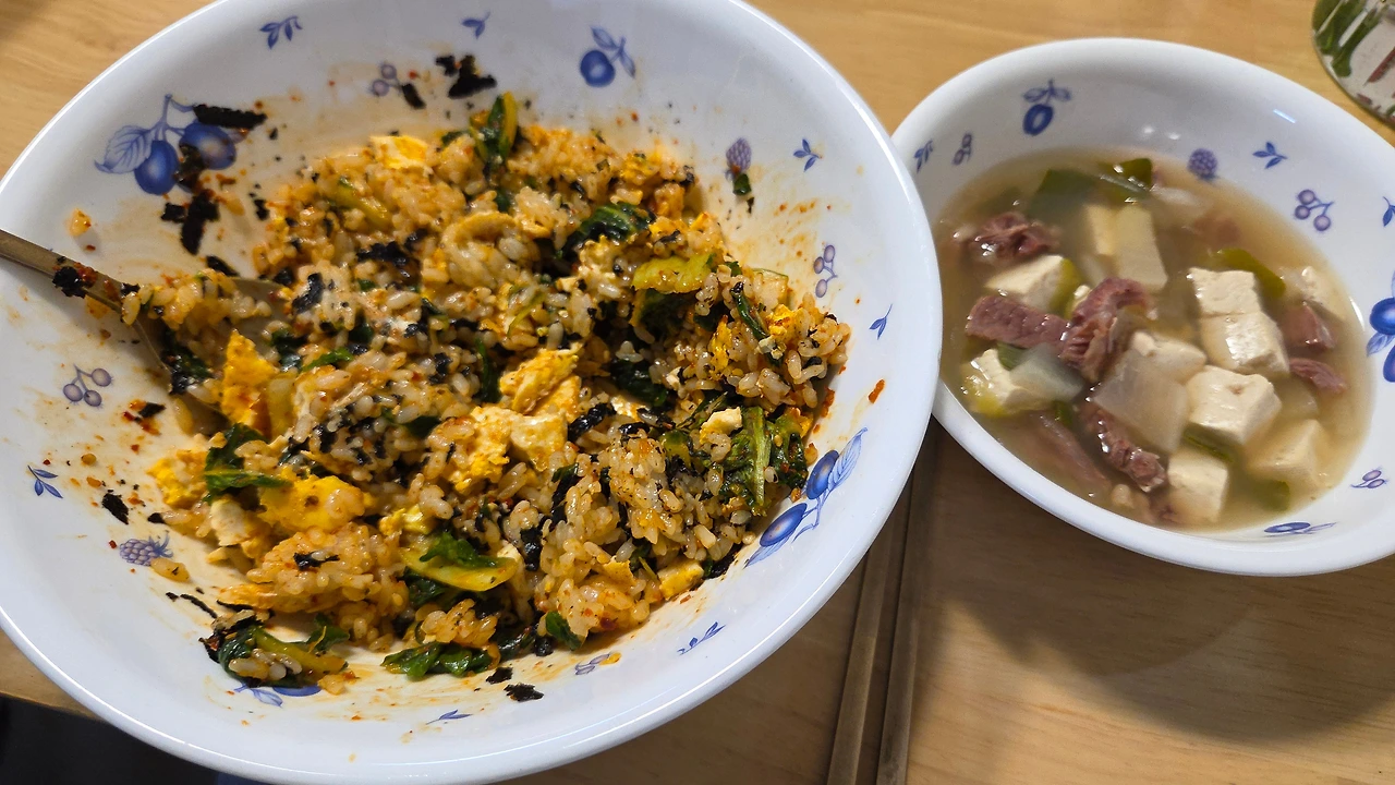 완성된 봄동겉절이 비빔밥과 친정엄마가 주고 가신 탕국 같은 갈비탕을 함께 먹으니 너무나 잘 어울리는 든든한 한 끼 식사가 되었다.