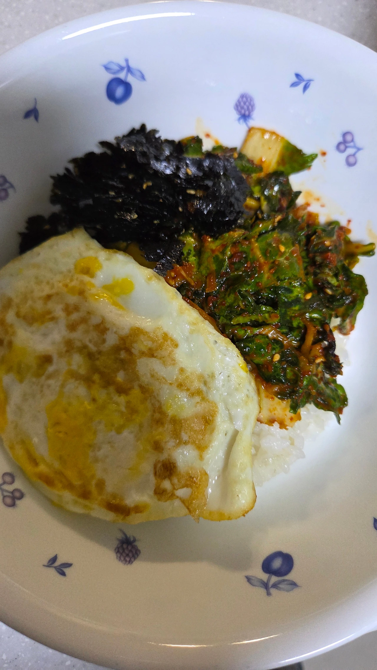 그렇지만 우리는 비빔밥을 먹을 거라서 밥 위에 봄동겉절이를 올리고 계란프라이와 김가루를 곁들였다.