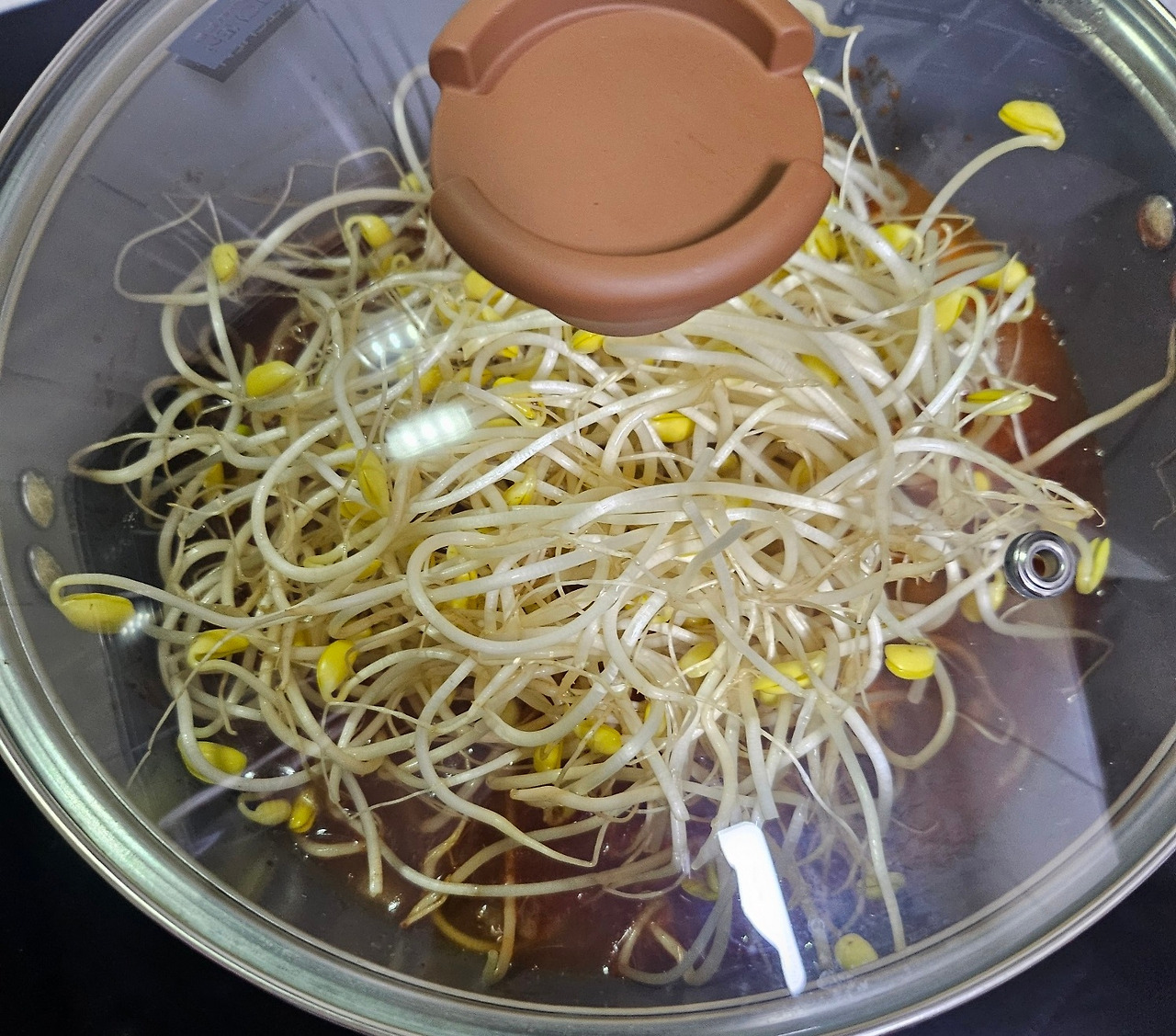 이제 씻어둔 콩나물을 넣고 물을 1L 부은 후 뚜껑을 덮고 센 불에서 팔팔 끓여준다.