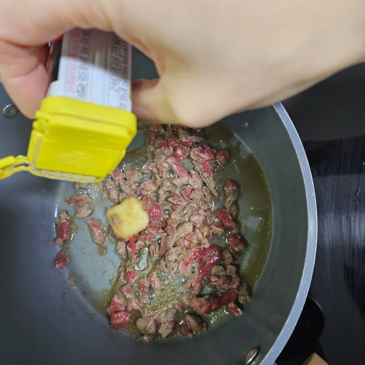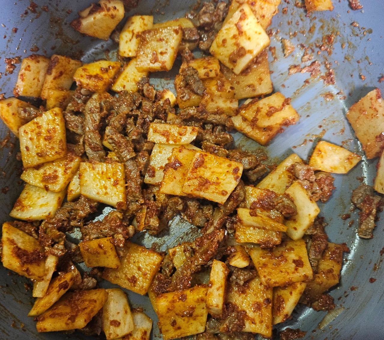 대파는 어슷하게 굵게 썰어두고, 무는 굵게 나박 썰기 한다. 콩나물은 씻어서 준비해 두고, 소고기는 흐르는 물에 핏물을 한 번 헹궈내고 물기를 대충 짜서 달군 냄비에 넣고 고기누린내 방지를 위해 후추 톡톡, 다진 마늘 한 수저 넣고 센 불에서 달달 볶는다.