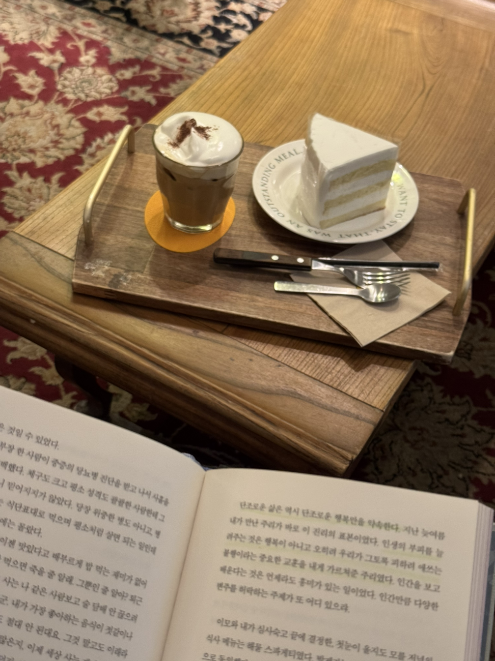 그곳에 오래 머물지는 못했지만, 짧은 시간 동안 가져간 책 『모순』을 읽으며 특별한 시간을 얻었다. 밥 한 끼 값이나 하는 디저트와 커피를 사서 억울하지 않으려 마음껏 행복해하기로 했다.