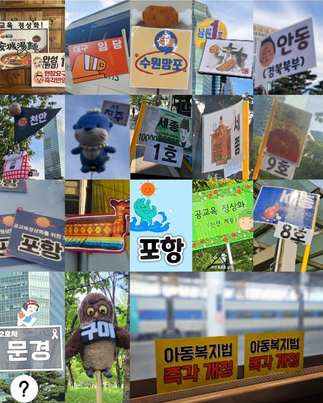 600대에 달하는 관광버스를 타고 KTX를 타고 상경한 지방 선생님들. 지역을 알리는 피켓도 얼찌나 재밌는지... (출처: 교사 온라인 커뮤니티)
