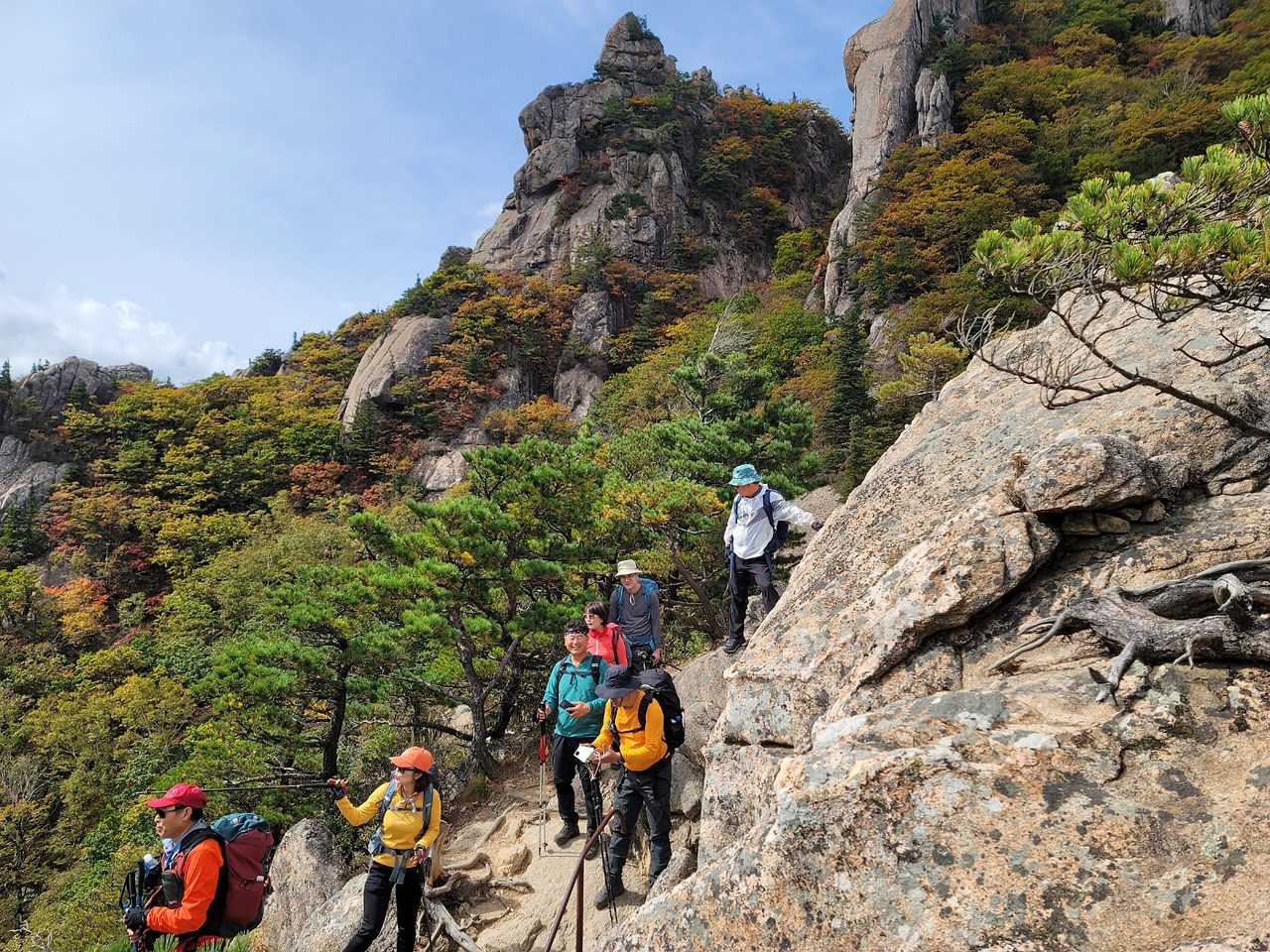 좁은 산행로에서 틈만 나면 비켜서 호흡을 고른다. 등산 초보가 대부분인 남편의 친구들은 이날을 위해 올여름 내내 체력훈련을 했다고 한다. 한주도 쉬지 않고 동네 뒷산을 오르고 체육관을 다녔다고 한다. 겁을 잔뜩 먹고 왔는데 막상 오르니 별거 아니라는 농담도 던지는데 웃음이 나온다. 공룡의 참모습을 몰라서 하는 말이다.