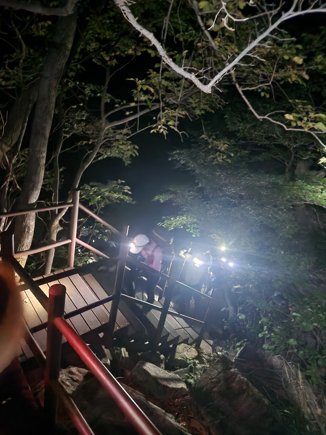 사방은 깜깜하고 하늘엔 별이 총총 떴다. 랜턴을 켜고 산행을 시작했다. 유경험자는 내가 유일하여 맨 앞에 섰다. 기대와 긴장으로 가슴까지 두근거린다. 새벽공기가 시원하다. 추운 줄 알고 바람막이, 패딩, 점퍼를 가방 가득 넣어왔는데 괜한 짐만 되겠다.