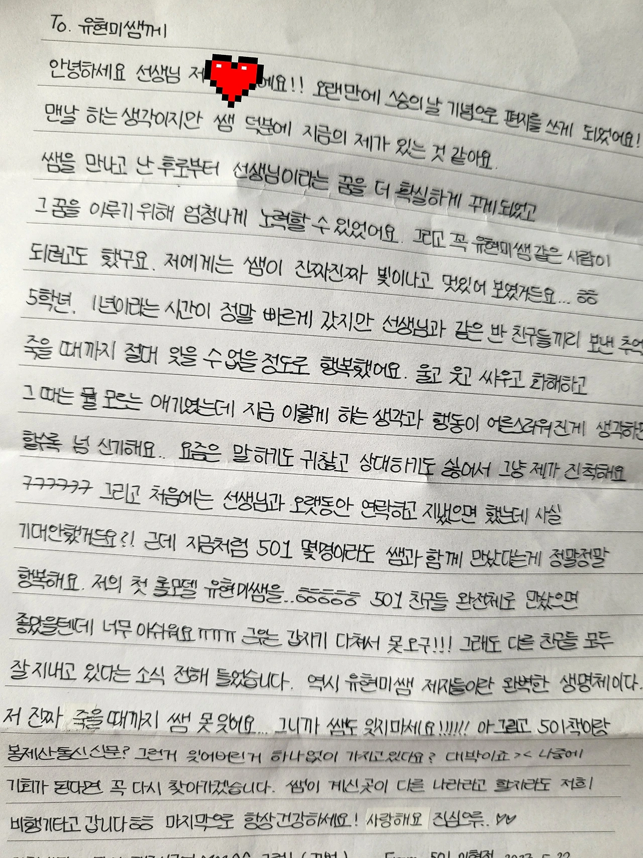 현정이는 선생님처럼 교사가 되고 되고 싶다며 열심히 공부하고 있다고 편지를 보냈다.