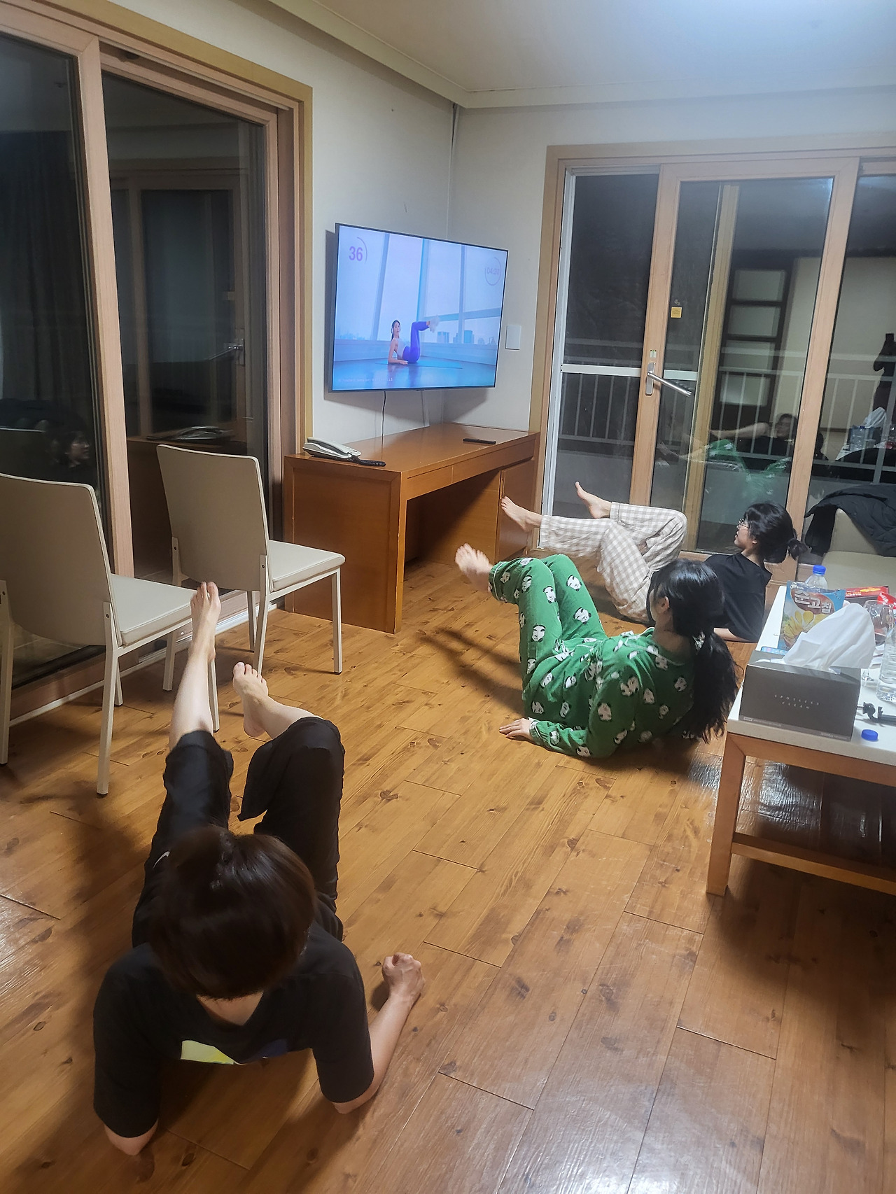 산 좋고 물 좋은 풍광을 품은 숙소에서 포도주잔을 기울이며 밤늦도록 얘기꽃을 피웠다. 그러다 누가 먼저 시작했을까. 20분짜리 홈트레이닝 동작을 너무도 진지하게 한다. 달밤에 체조는 딱 요럴 때 쓰는 말이다. 내친김에 젊은 선생님들에게 댄스 레슨을 받기로 했다. 국가대표급 몸치인 나는 생전 처음 해보는 K-POP 댄스에 식은땀이 삐질삐질 났다. 유튜브를 보고 따라만 하면 되는데 손발이 따로 놀고 어정쩡한 자세가 코미디가 따로 없다. 그러다 거실 유리창에 비춘 허우적대는 우리 모습에 바닥을 데굴데굴 구르며 웃었다.
