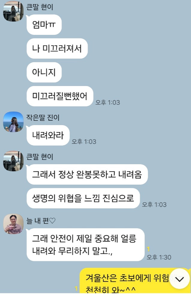 그때부터 폭풍 잔소리를 시작했다. 산이 그렇게 만만하냐, 특히나 겨울산을 위험하다, 장비 없이 갔다가 큰코다친다…. 딸이 웃는다.