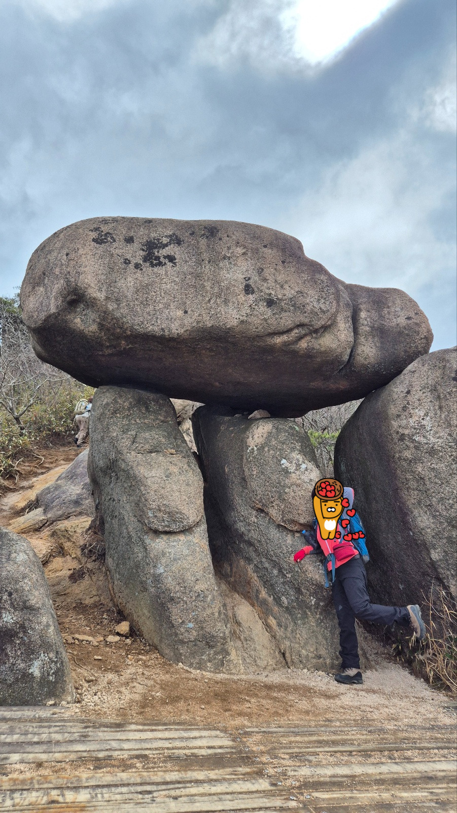 어느덧 월출산의 명물 ‘구름다리’에 도착했다. 붉은색 철제 다리가 해발 육백 미터 칼날 같은 사자봉과 매봉에 걸쳐있고 다리 아래는 천 길 낭떠러지다. 고소 공포증이 있는 회원 한 분은 일찌감치 노선을 변경했다. 삐죽 솟은 암봉을 병풍 삼아 일행들과 서로 사진을 찍어줬다. 하산길이 즐거워진 건 계곡에서 들리는 물소리 때문만은 아니다. 저 멀리 뒤처지는 남편의 발걸음 덕분이다. 핑곗거리 찾아가며 가뭄에 콩 나듯 산을 댕기는 남편에게 이게 벼락치기의 한계라며 놀렸다.