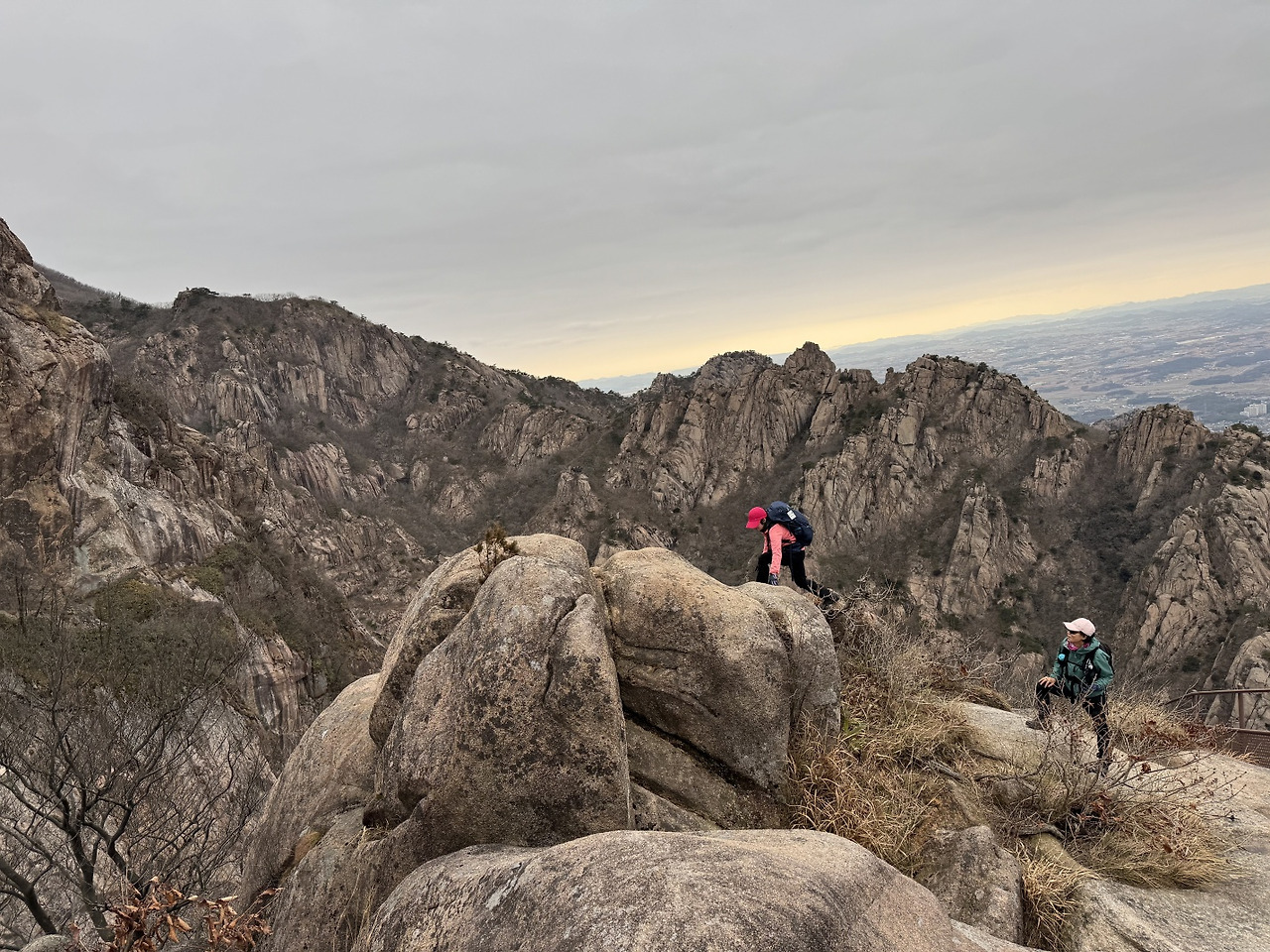 곧 싹 틔울 가지 끝 겨울눈도 쳐다보고 무심한 까마귀 소리에 귀 기울이다 보니 어느새 능선에 올랐다. 오늘 걸어야 할 길이 눈앞에 굽이굽이 펼쳐진다. 문득 돌아보니 저 멀리 영산강이 흐르고 그 너머 목포 앞바다가 펼쳐진다. 이제부터는 뾰족한 바위 봉우리를 오르락내리락 걸으며 바위산의 향연을 즐기면 된다. 사람들이 왜 월출산을 호남의 ‘소금강’이라고 하는지 실감한다. 오형제 봉이 장엄하고 고인돌, 통천문 등 갖가지 바위 형상들이 예사롭지 않다. 앞서 걷던 산우들도 중국의 명산 못지않다며 연신 감탄사를 터트린다.
