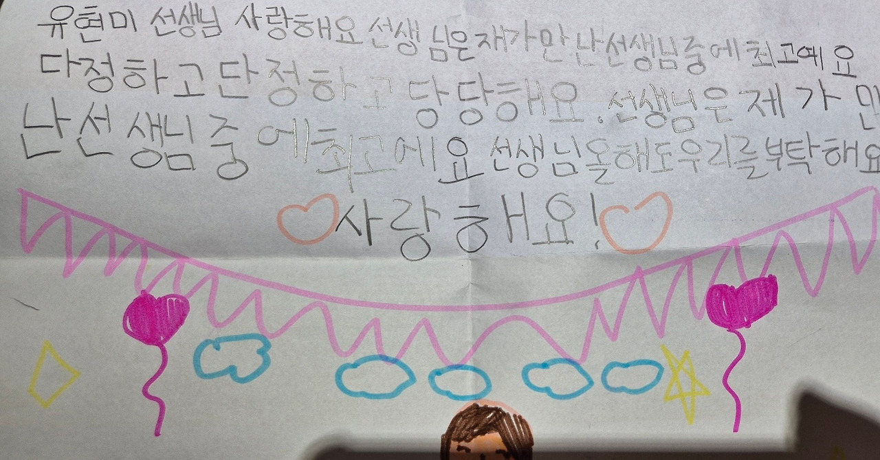 하지만 인영이는 소문과는 달랐다. 조심스러운 걸음, 낯선 교실에서 작게 뜬 눈, 서툰 미소. 며칠 지나지 않아, 아이는 수줍게 편지를 내밀었다. 삐뚤빼뚤한 글씨로 "선생님이 좋아요"라고 적혀 있었다.