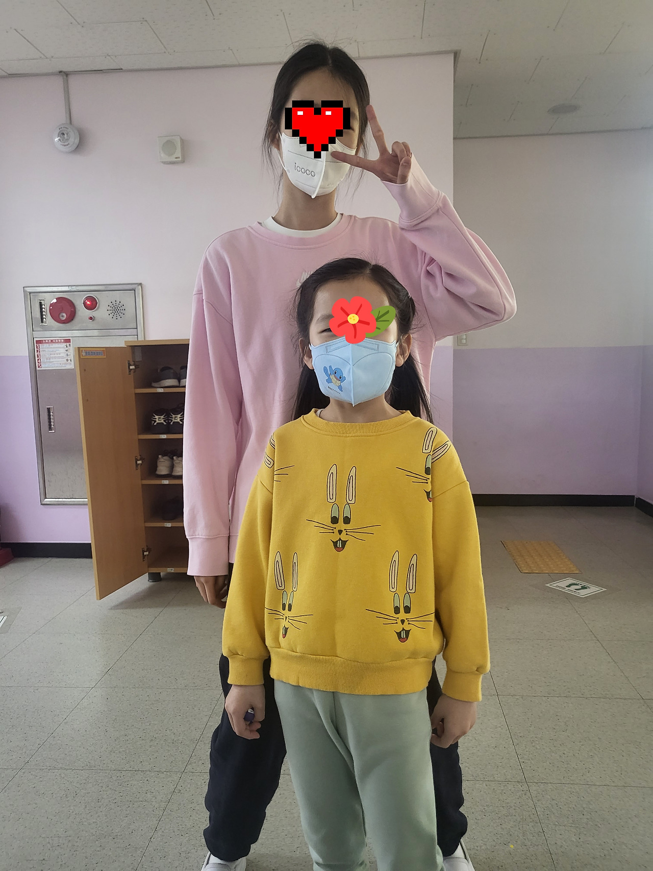 동생들이 나타나면 “아유 귀여워.”를 연신 외친는 6학년들. 우리 반 최고 장신 언니와 꼬꼬마 작년 제자.