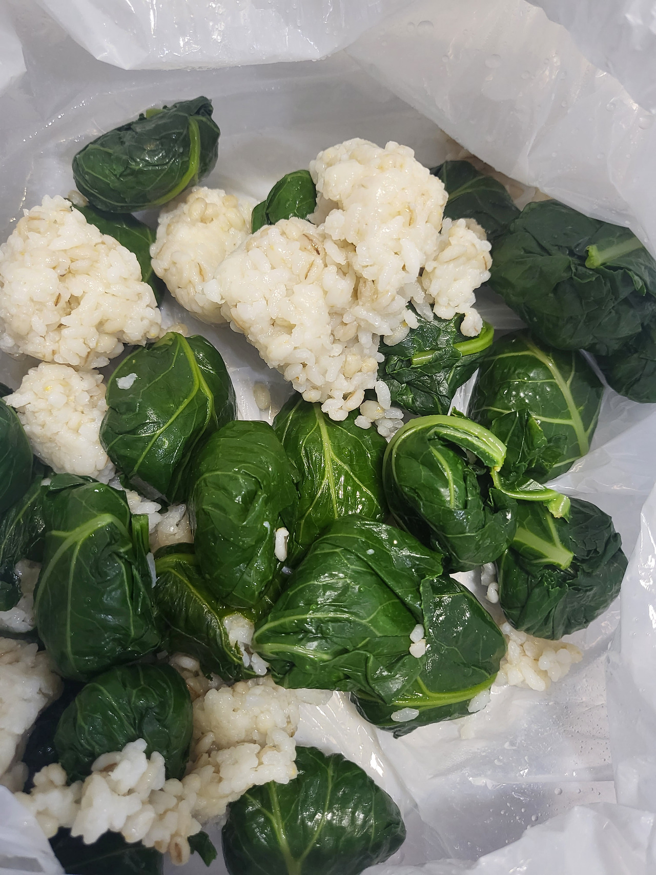 팔지도 못하고 가져온 주먹밥과 케일 쌈밥. 일일이 손으로 싼 딸의 고생이 생각나 목구멍에서 막힌다.