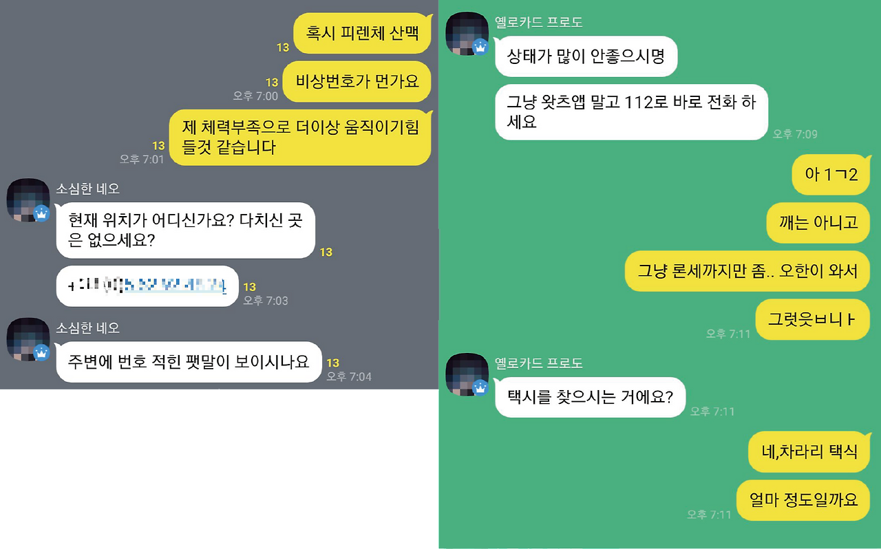 핸드폰에 112를 찍고 포기하려는 순간 한 명의 여성분이 괜찮다고 말하는 나를 보고 "무슨 소리냐"고 말하며 곧바로 본인의 우비를 벗어 체온을 유지하라며 덮어주고 도와줄 방법을 모색하고 있었다. 그렇게 한 명씩 모이더니 총 8명의 외국인들이 나를 둘러싸고 무슨 도움이 필요한지 본인이 무엇을 할 수 있는지 서로 이야기하며 있는 신기한 상황이 벌어졌었다. 하지만 나는 그 광경이 너무 부끄러웠다. 다들 나보다 나이가 많았고 심지어 많이 어린 친구도 있었다. '나는 왜 이것조차 해내지 못하는 거지', '나는 정말 나약한 사람이구나'를 생각하고 있는 와중에
