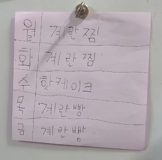 "엄마, 월요일은 계란찜, 화요일도 계란찜, 수요일은 핫케이크, 목요일은 계란빵, 금요일도 계란빵 해 줘."