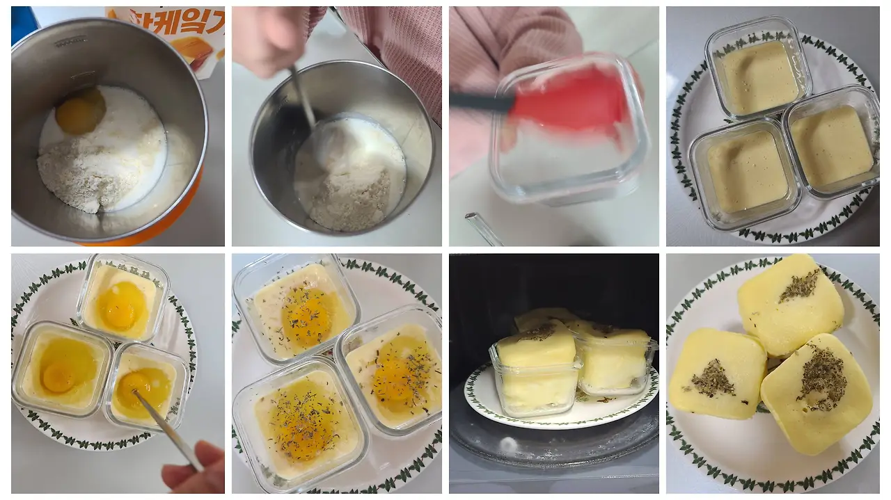 큰 도자기 접시 위에 반죽을 담은 유리 용기 3개를 올려 7~8분 정도 전자레인지에 돌린다. 계란빵이 천천히 익어가며 부풀어 오르고 노릇한 향이 퍼지면 아이는 냄새에 이끌려 식탁에 앉는다. 졸린 눈을 반쯤 감은 딸이 "오늘은 계란빵이네." 하며 웃는다. 빵을 먹는 날은 우유도 곁들여 준다. 목이 멜 수도 있고 평소 우유를 안 먹는 아이에게 "우유는 빵과 함께 먹는 거야."라는 작은 공식을 만들어 주었다. 갓 만든 빵 한 조각을 베어 문 아이의 흡족한 표정은 하루의 시작을 따스하게 밝혀주는 아침 햇살 같다.