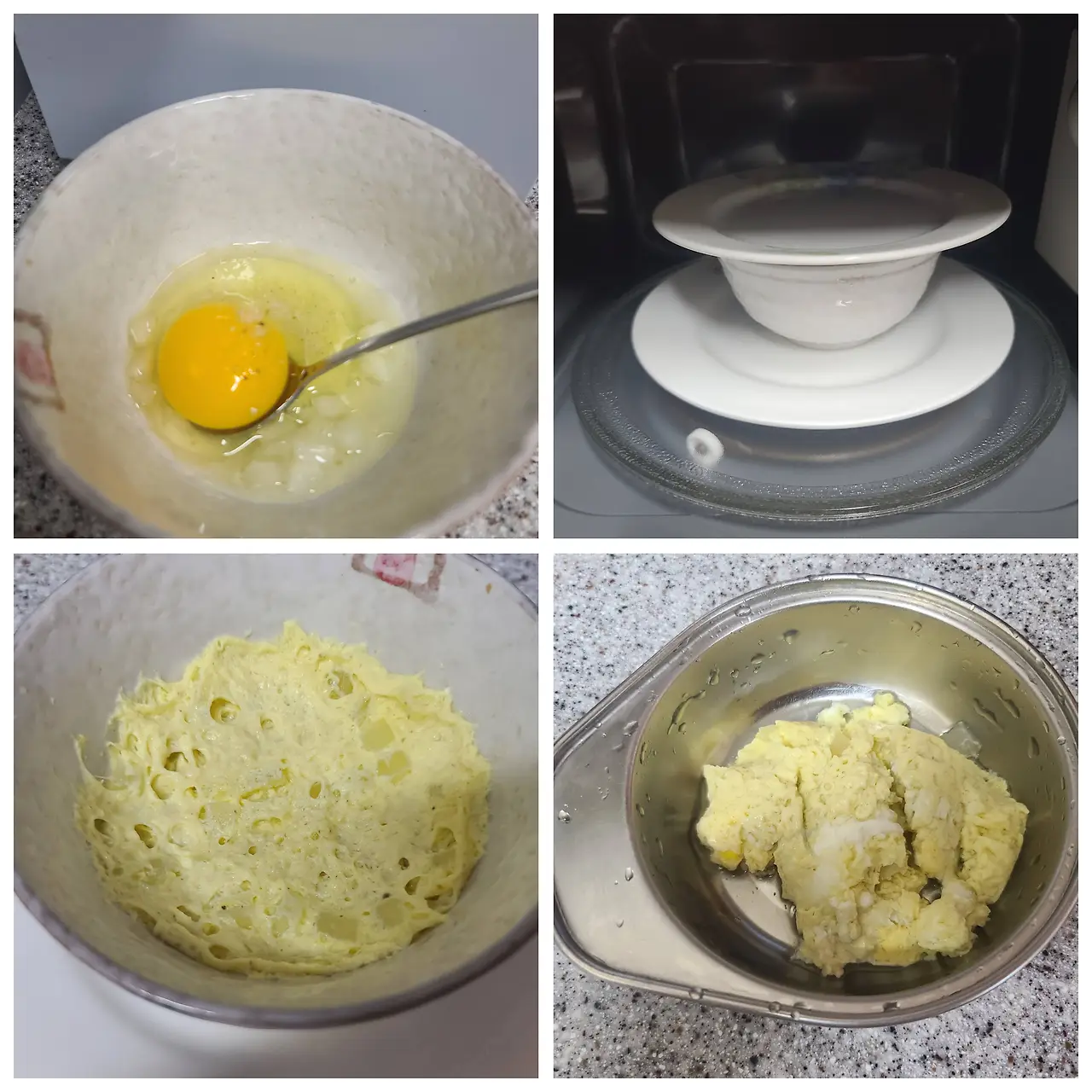 5. 노른자를 젓가락으로 살짝 터뜨려 준다. 그렇지 않으면 노른자가 전자레인지 안에서 터질 수 있다.