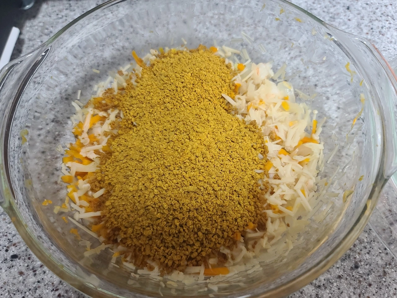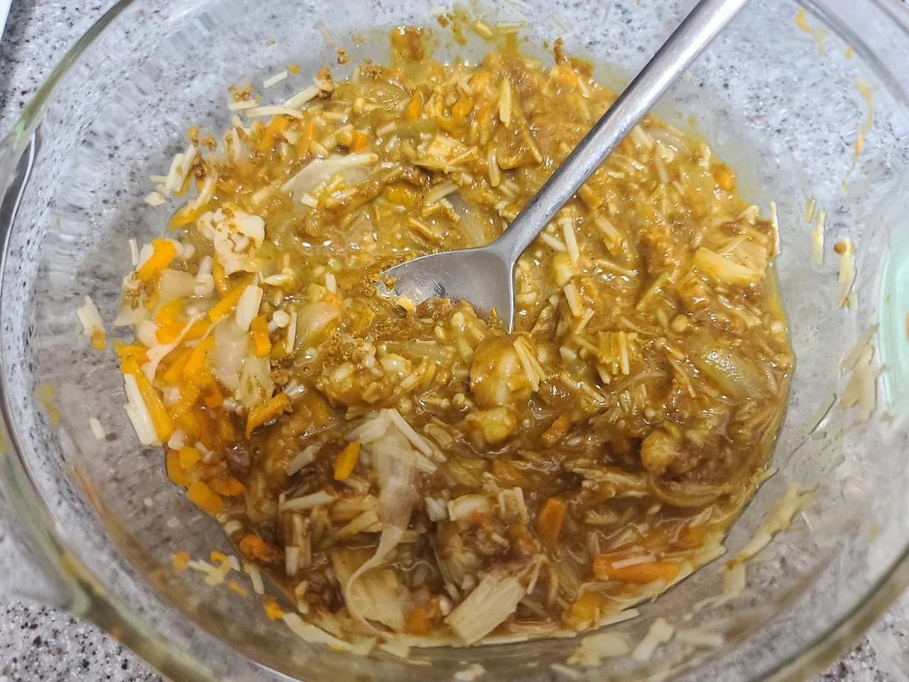 1. 냉장고 야채칸에 들어있던 양파, 당근, 버섯을 손에 잡히는 만큼 스테인리스 가위로 대충 잘게 자른다. (요리를 대충 편하게 눈대중으로 하는 편이다) 냉동칸의 새우를 꺼내서 야채와 같이 3분 정도 전자레인지에 익힌다.
