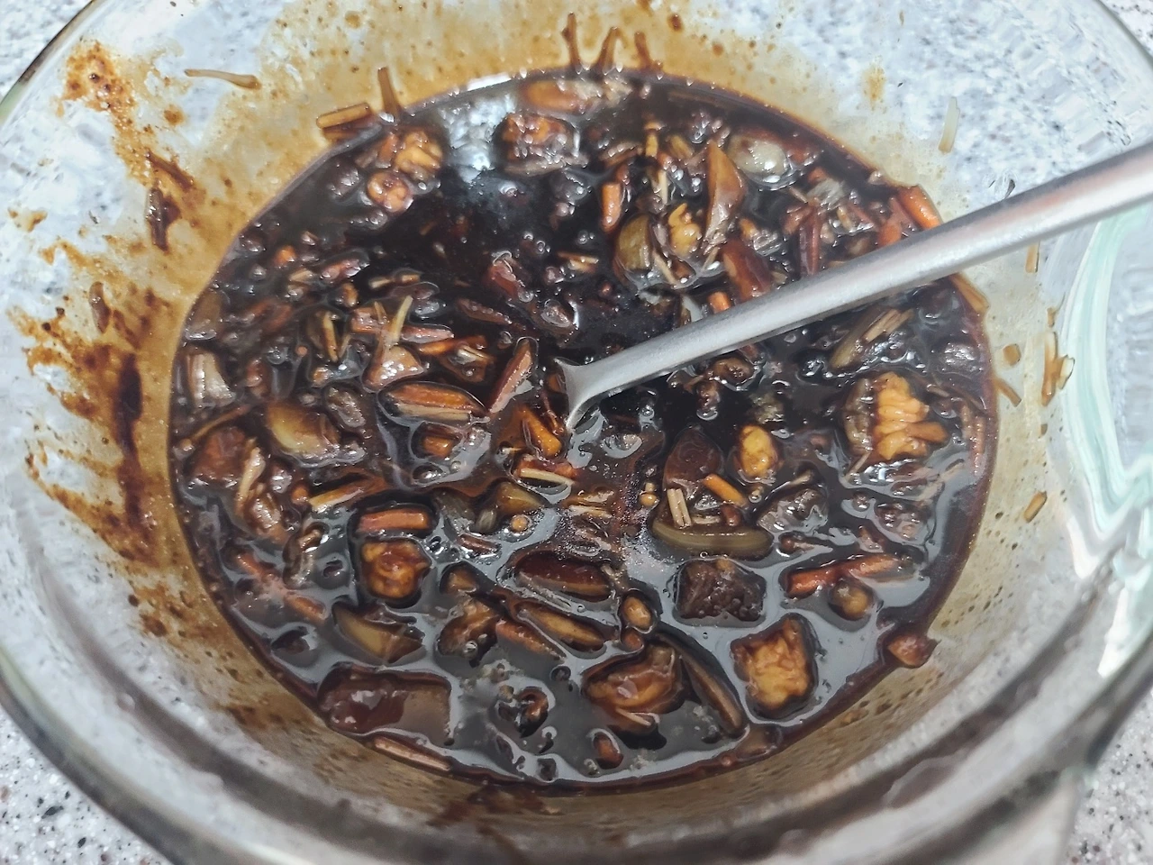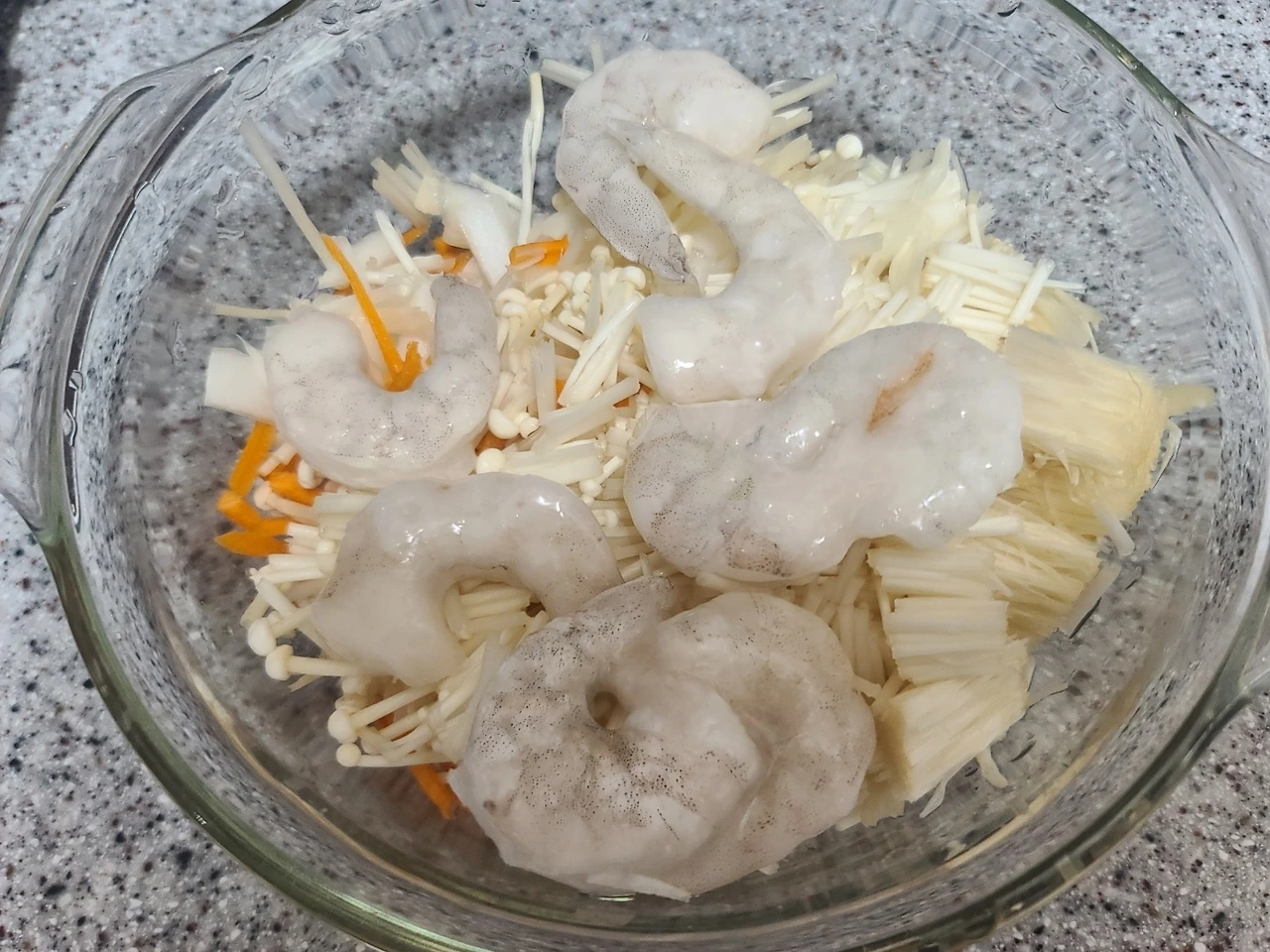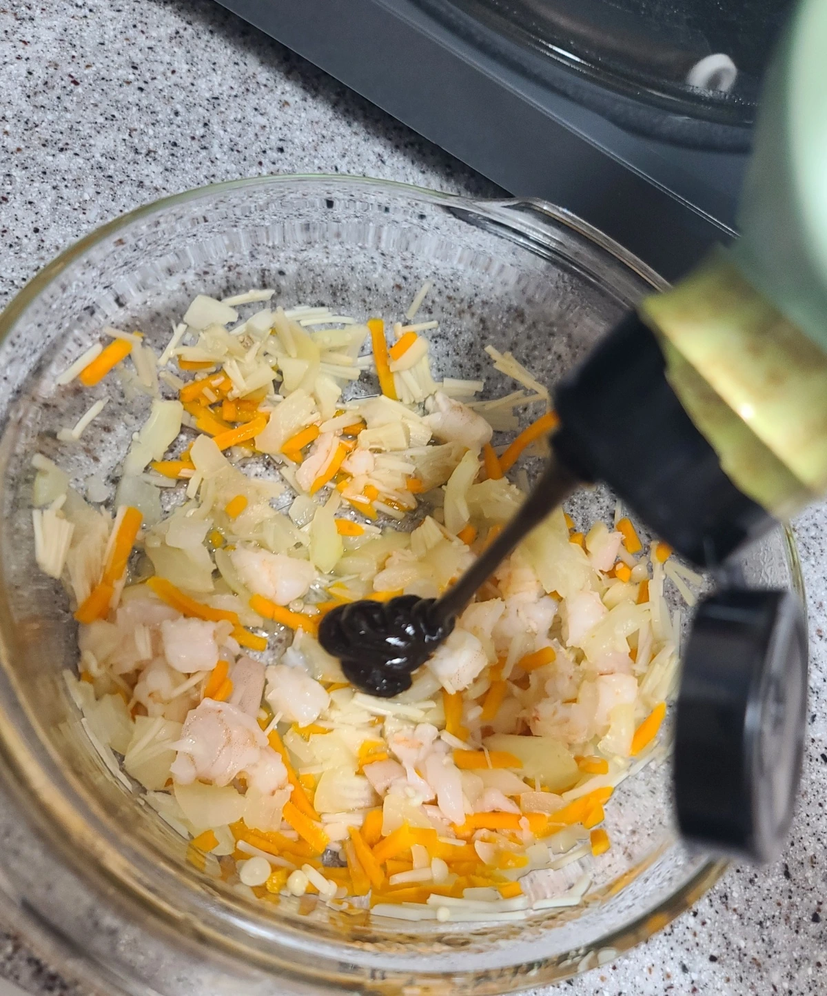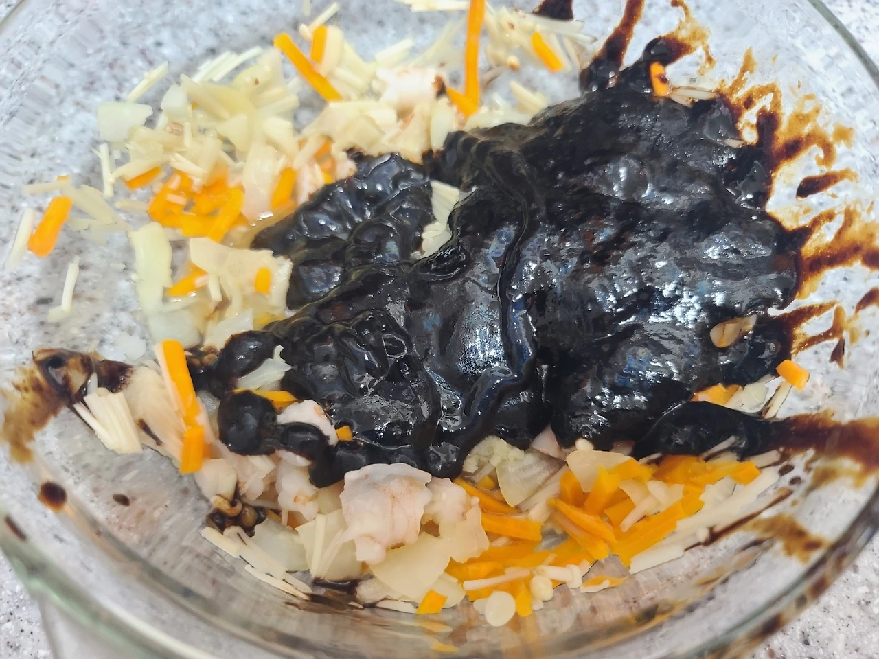 전자레인지로 적당히 익은 야채와 새우에는 채수가 생긴다. 카레에는 물을 넣어야 하지만 짜장을 만들 때는 액상 짜장소스만 적당히 넣어주고 전자레인지 3분 돌리면 완성이다.