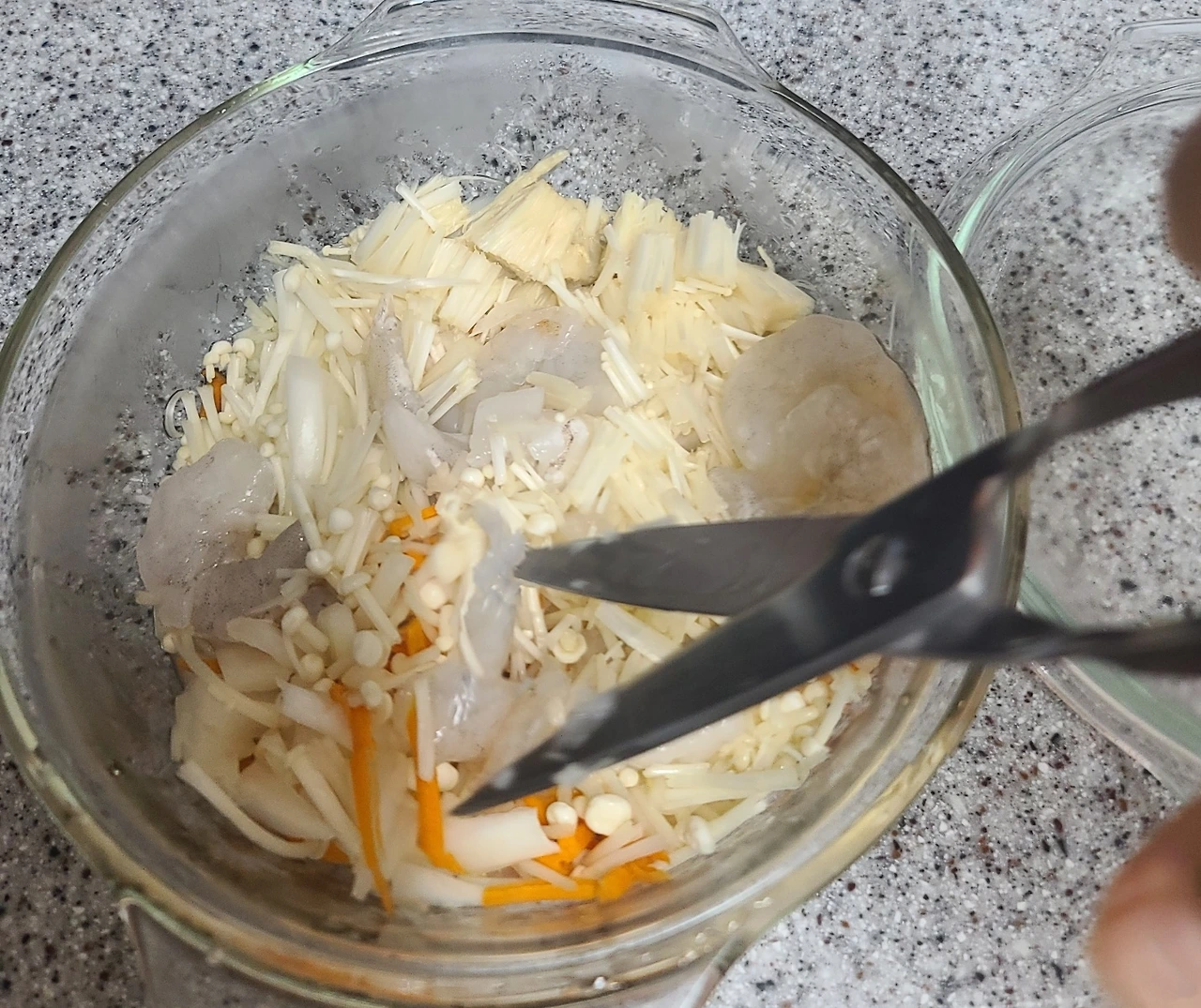 2. 살짝 익힌 재료들은 다시 스테인리스 가위로 잘게 자른 후, 5분 더 익힌다.