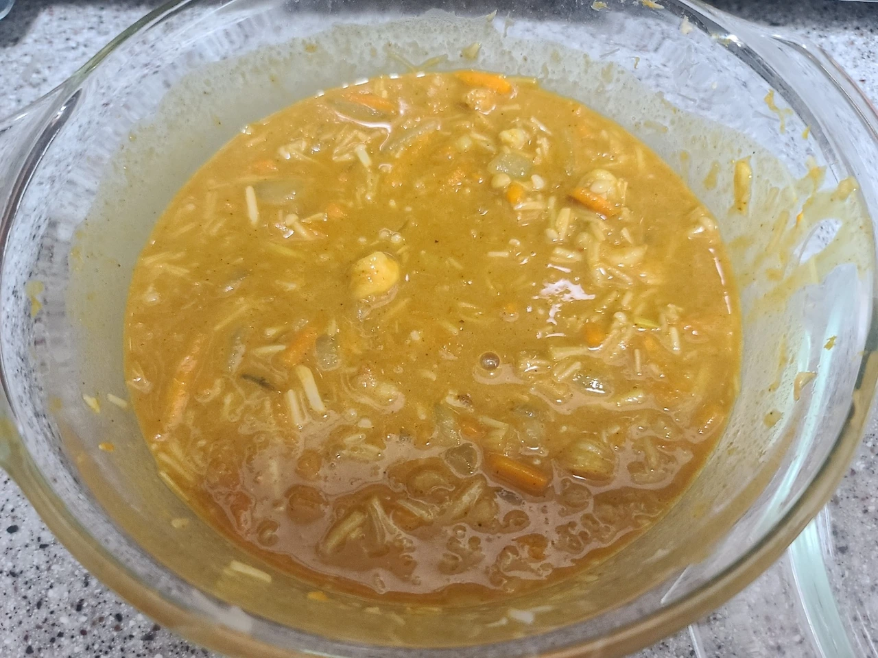 4. 뜨거운 물을 150ml 붓고 다시 섞어준 후, 3분 정도 전자레인지로 익히면 완성이다.