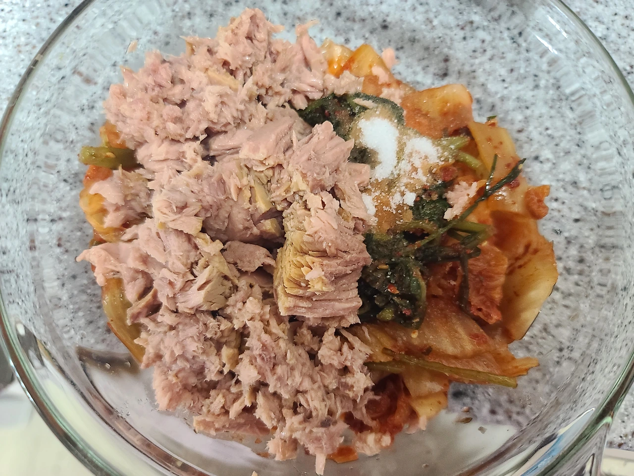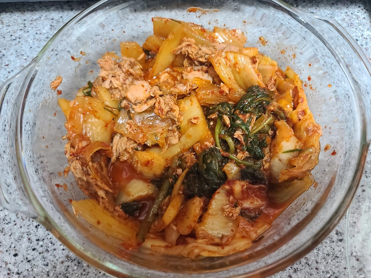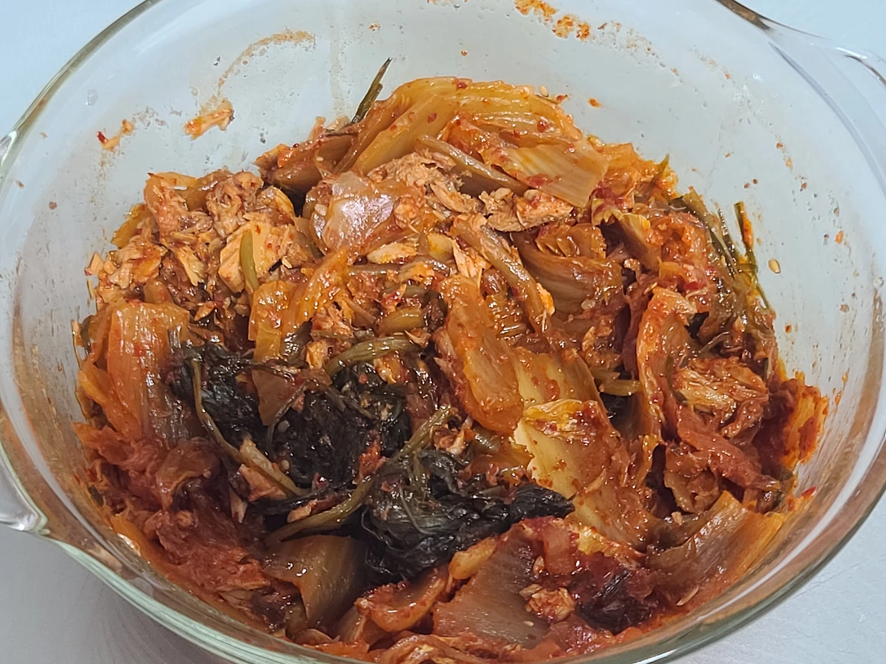 4. 뚜껑을 덮고 전자레인지에 5분 정도 돌리고 꺼내어 김치와 참치, 스테비아가 잘 섞이게 숟가락으로 저어준다. 맛을 보고 스테비아를 추가하거나 추가 없이 다시 5분을 돌리면 완성이다.