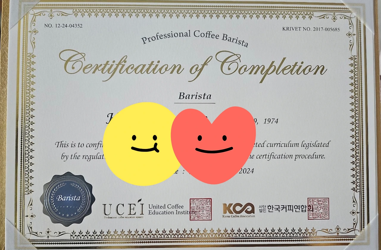 아무튼 내 인생 버킷리스트에도 없는 바리스타 자격증을 공부해서 당당히 2급 자격증을 획득했다. 그러나 저번에도 언급했듯 바리스타 자격증은 커피에 대한 약간의 관심, 시간, 돈, 체력만 있으면 누구나 딸 수 있는 자격증이니 관심 있는 사람은 도전해 보시길. 어렵진 않아도 자격증이라고 받고 나니 뿌듯하다.