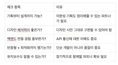 가능하다면 프론트와 백엔드 모두 맡을 수 있는 올인원 외주팀을 선택하세요.