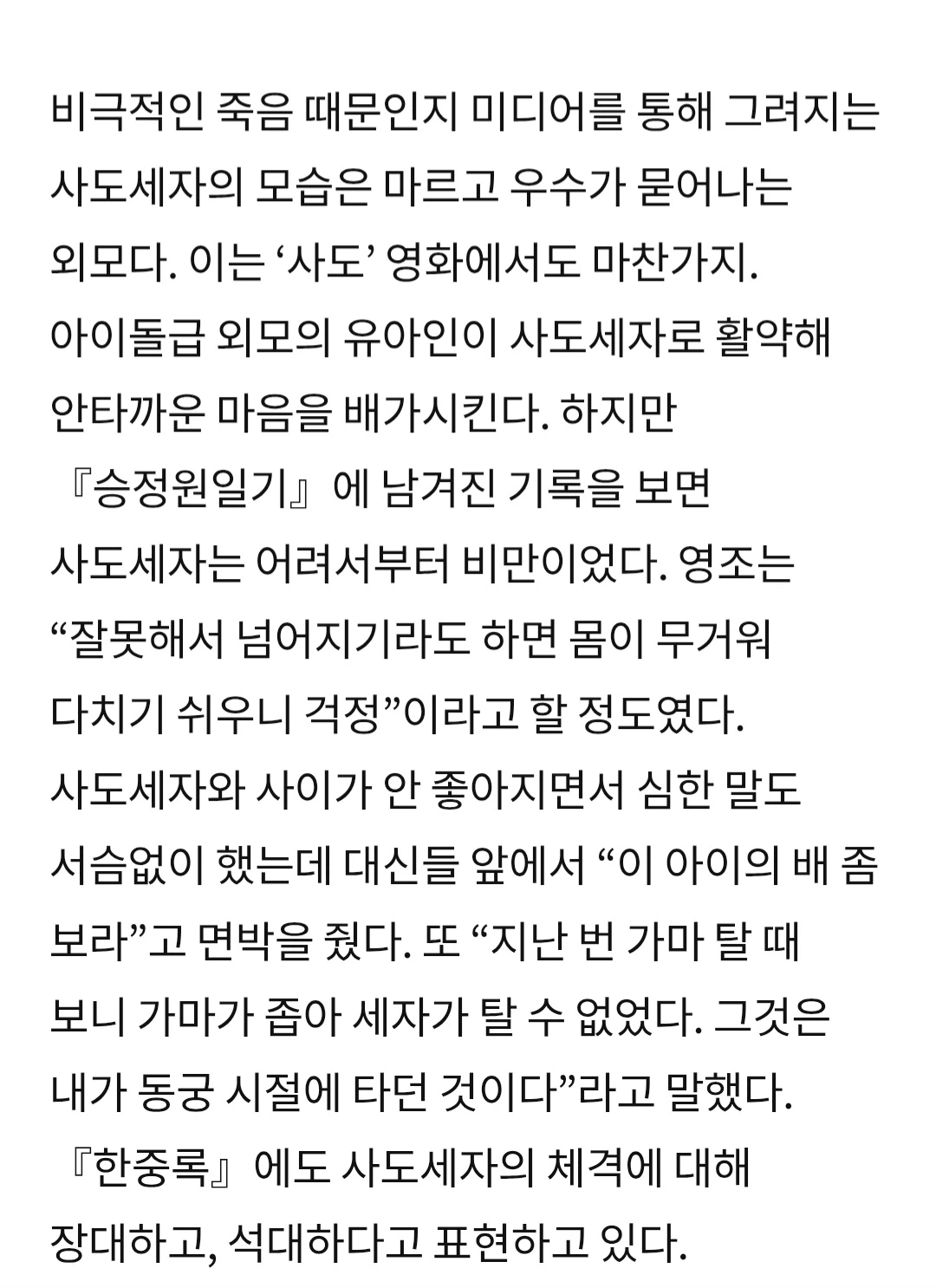 초장편 영화나 드라마가 아니라서 영화는 좀 타이트하다. 그럼에도 영화가 전달하고자 하는 사건과 비극은 잘 전달됐다. 왕과 필부가 추구하는 것이 얼마나 다르고 그로 인한 갈등과 큰 집안이라서 생긴 비극이 얼마나 쓰라린지는 사도를 보면 알 수 있다.