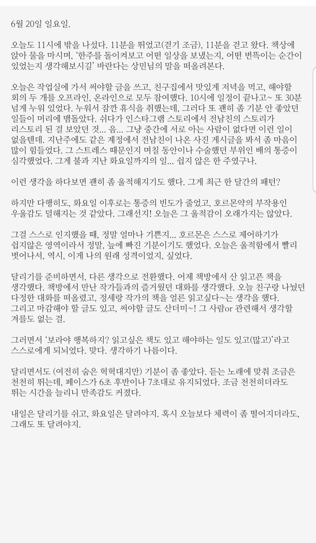달리면서도 (여전히 숨은 헉헉대지만) 기분이 좀 좋았다. 듣는 노래에 맞춰 조금은 천천히 뛰는데, 페이스가 6초 후반이나 7초대로 유지되었다. 조금 천천히더라도 뛰는 시간을 늘리니 만족감도 커졌다.